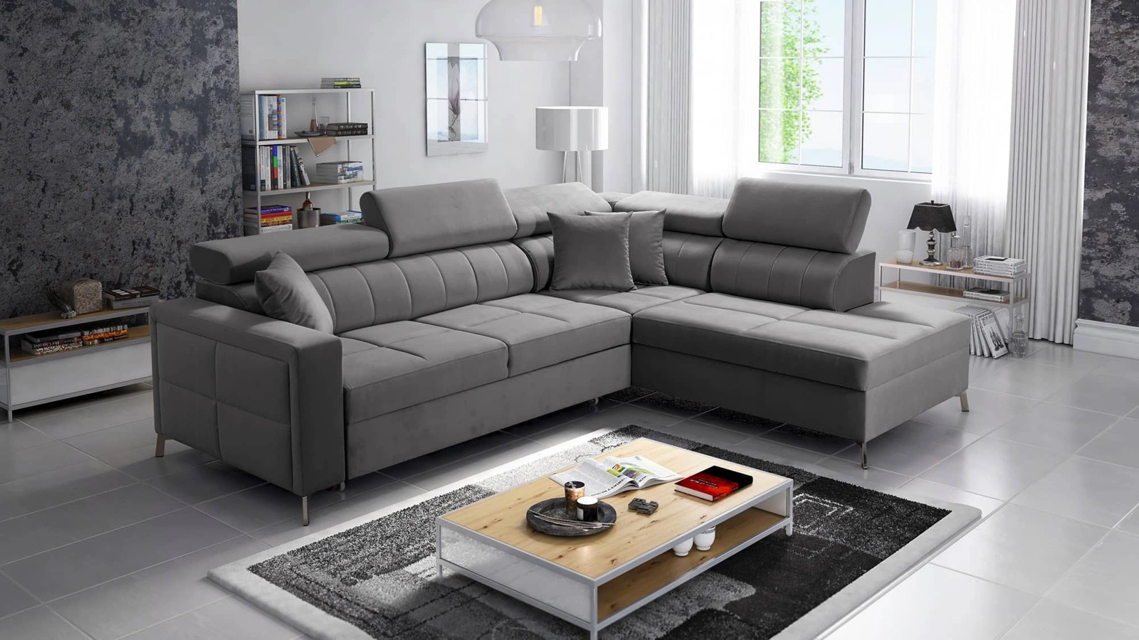 Rohová sedací souprava s funkcí spaní Nausa III šedá pravá sametová stylová pohodlná rohová sedací souprava nastavitelné opěrky hlavy nádoba na lůžkoviny