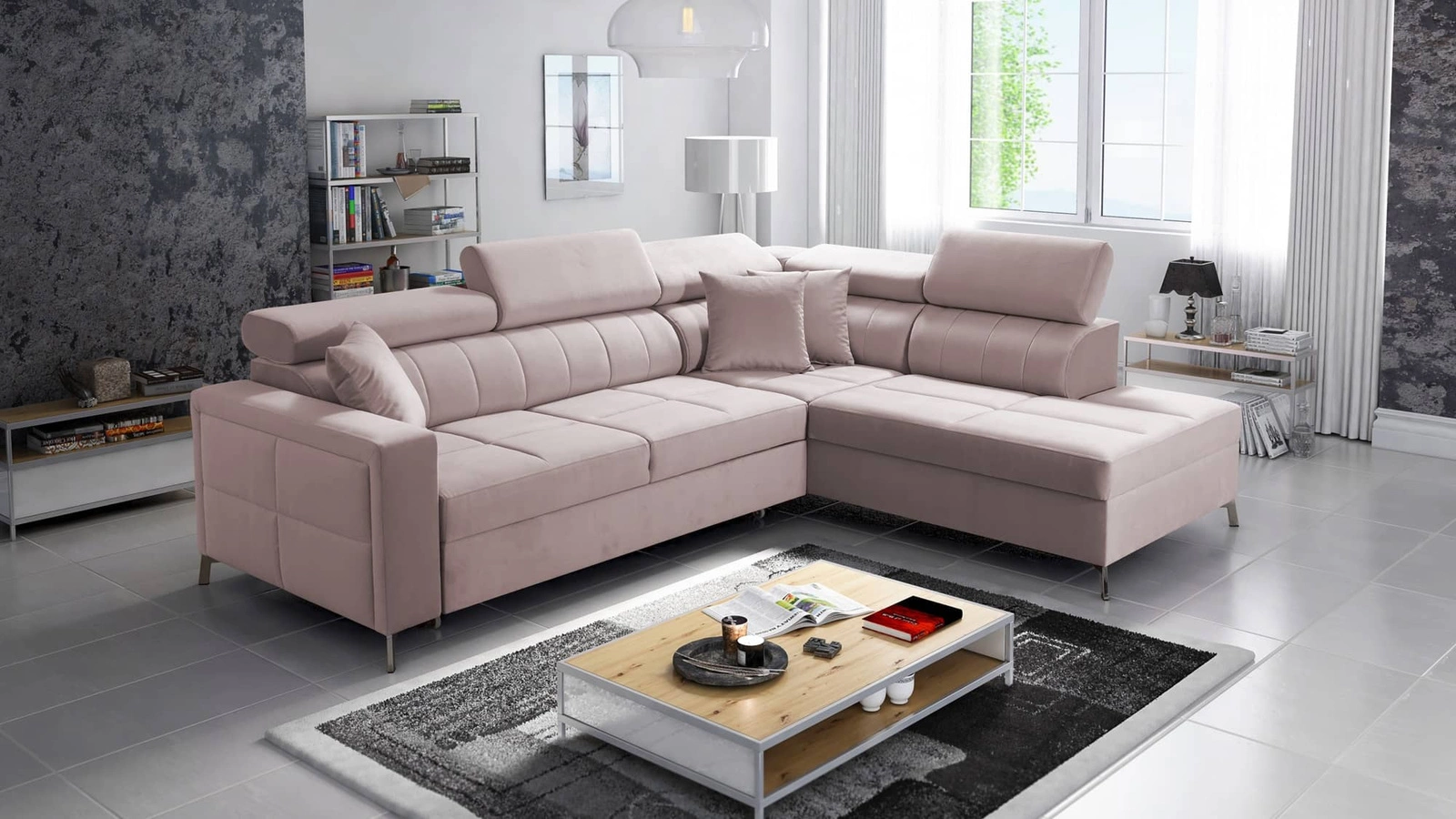 Rohová sedací souprava s funkcí spaní Nausa III pudrově růžová pravá sametová stylová pohodlná rohová sedací souprava nastavitelné opěrky hlavy kontejner na lůžkoviny