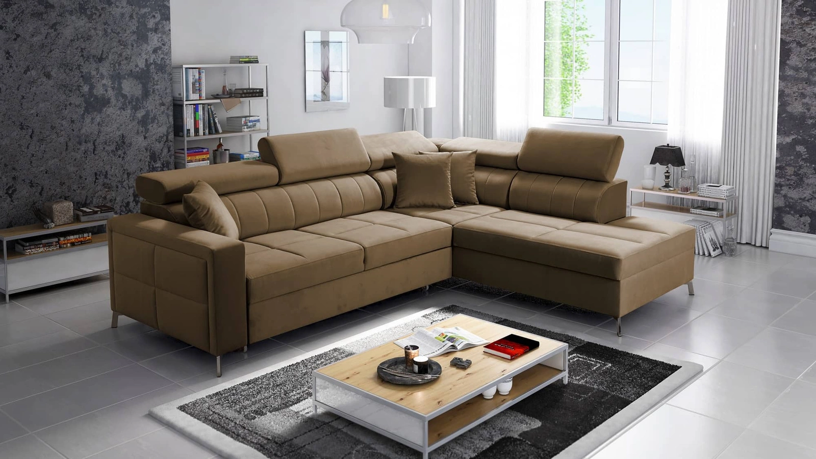 Rohová sedací souprava s funkcí spaní Nausa III světle hnědá pravý roh sametová stylová pohodlná rohová sedací souprava nastavitelné opěrky hlavy nádoba na lůžkoviny