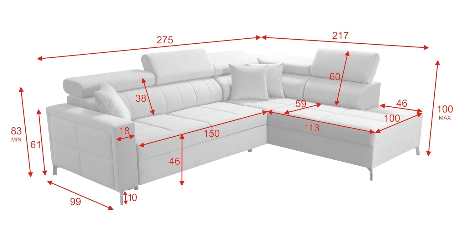Rozměry nábytku umožňují vyplnění prostoru v prostorném obývacím pokoji nebo zasedací místnosti. Šířka rohu 275 cm, maximální výška 100 cm a hloubka 217 cm. Spací plocha rohové jednotky je 127x210 cm. Výška sedadla nábytku je 46 cm a maximální výška opěradla je 60 cm. Vlnité pružiny a polyuretanová pěna T30 je materiál, z něhož je vyrobeno sedadlo rohu. Pevné opěradlo s nastavitelnými opěrkami hlavy umožní snadné adaptace úhel opěrek hlavy podle vašich preferencí a zaručí vám pohodlný odpočinek po dlouhém dni, který oceníte vy, vaši blízcí i hosté, kteří se na tuto jedinečnou rohovou pohovku posadí.