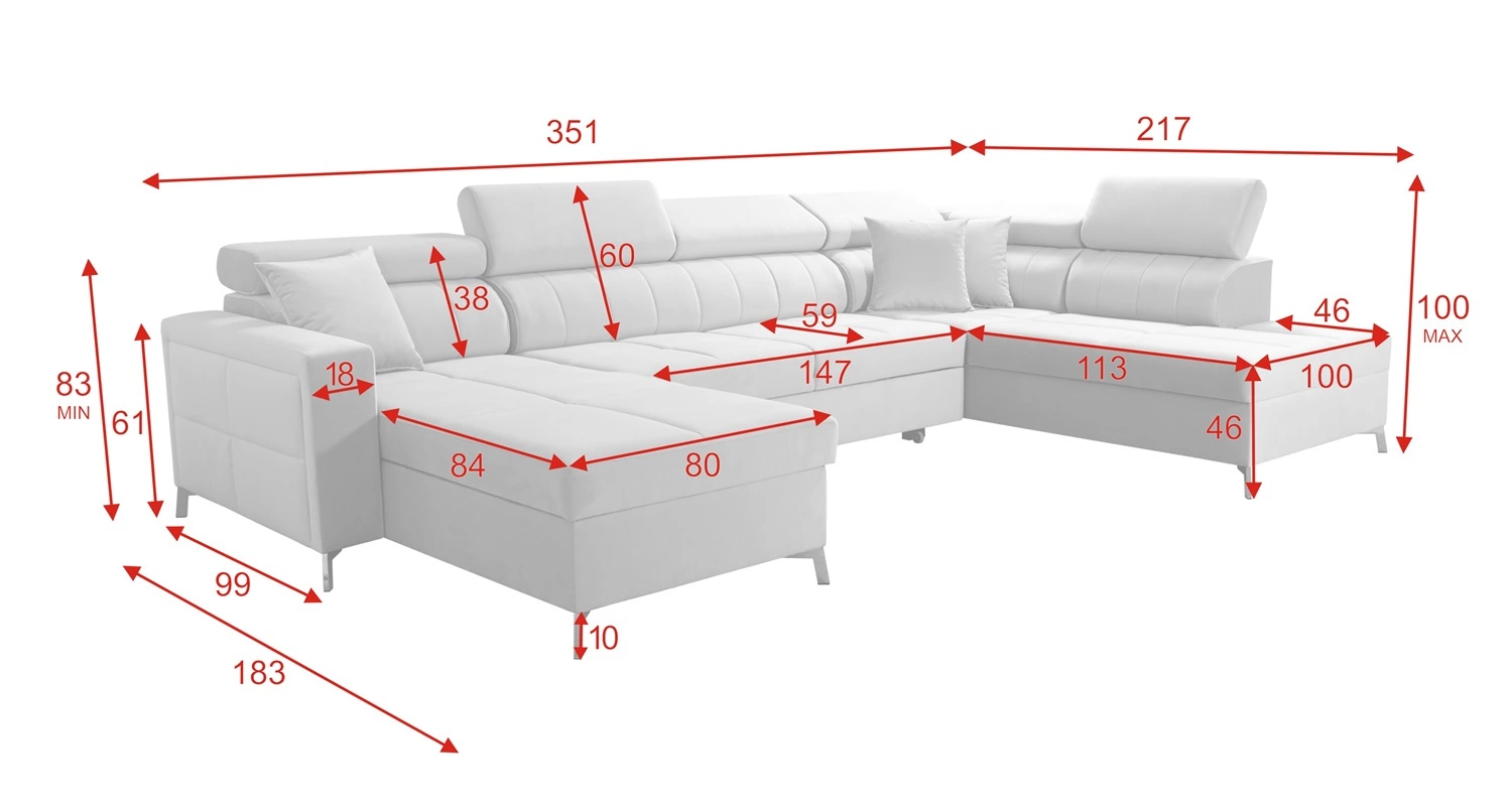 Rozměry nábytku umožňují vyplnění prostoru v prostorném obývacím pokoji nebo zasedací místnosti. Šířka rohu 351 cm, maximální výška 100 cm a hloubka 217 cm. Spací plocha rohové jednotky je 127x286 cm. Výška sedadla nábytku je 46 cm a maximální výška opěradla je 60 cm. Vlnité pružiny a polyuretanová pěna T30 je materiál, z něhož je vyrobeno sedadlo rohu. Pevné opěradlo s nastavitelnými opěrkami hlavy umožní snadné adaptace úhel opěrek hlavy podle vašich preferencí a zaručí vám pohodlný odpočinek po dlouhém dni, který oceníte vy, vaši blízcí i hosté, kteří se na tuto jedinečnou rohovou pohovku posadí.
