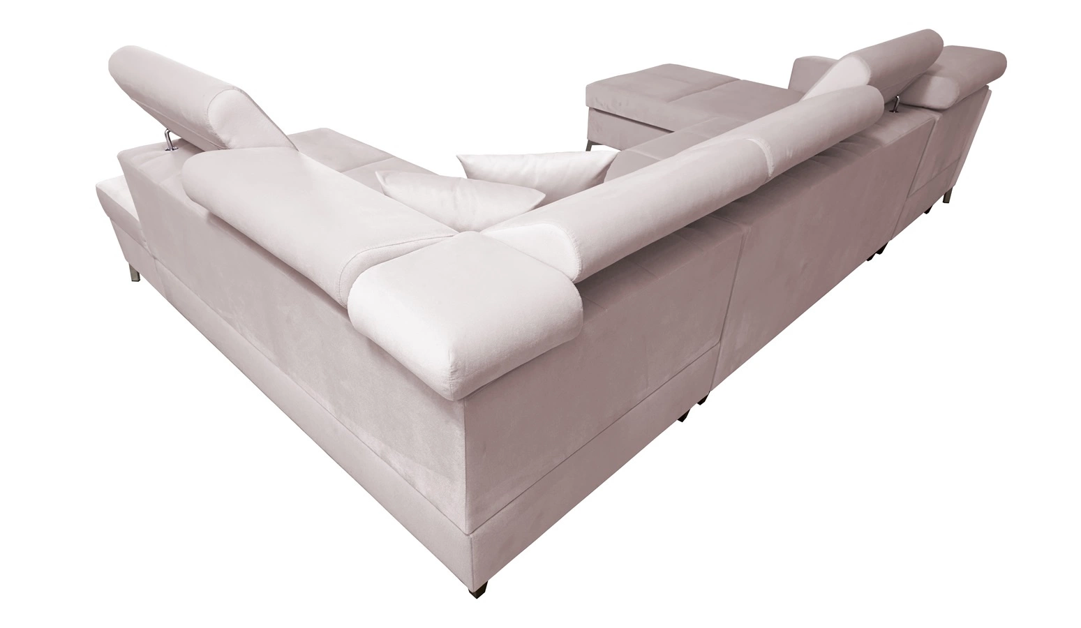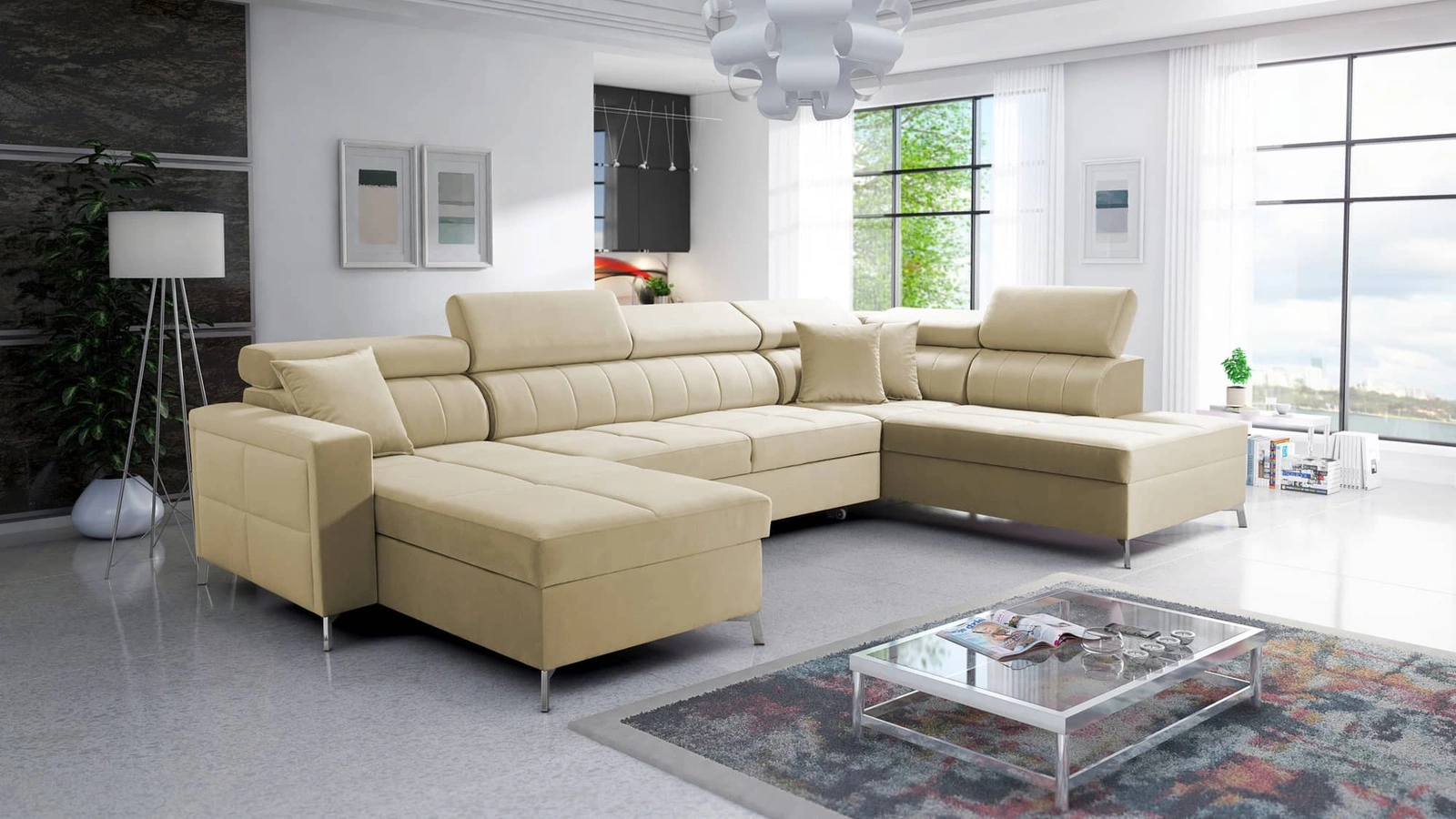 Rohová pohovka Nausa VI v béžové barvě s nastavitelnými opěrkami hlavy je elegantním kusem nábytku, který se hodí do každého interiéru.