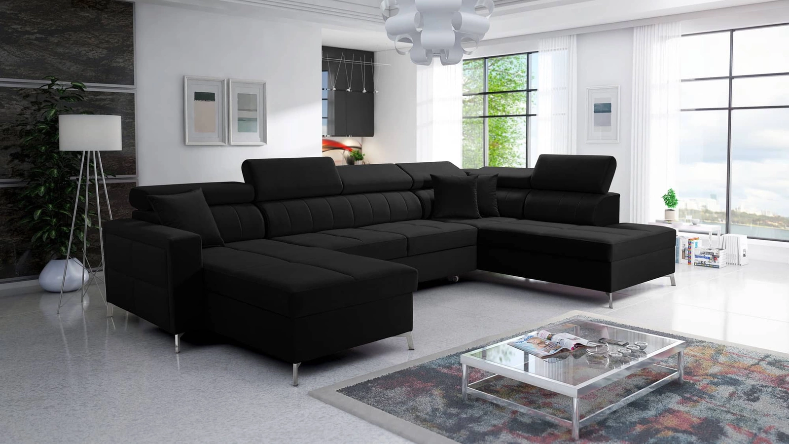 Rohová pohovka Nausa VI v černé barvě s nastavitelnými opěrkami hlavy je elegantní kus nábytku, který se hodí do každého prostředí.
