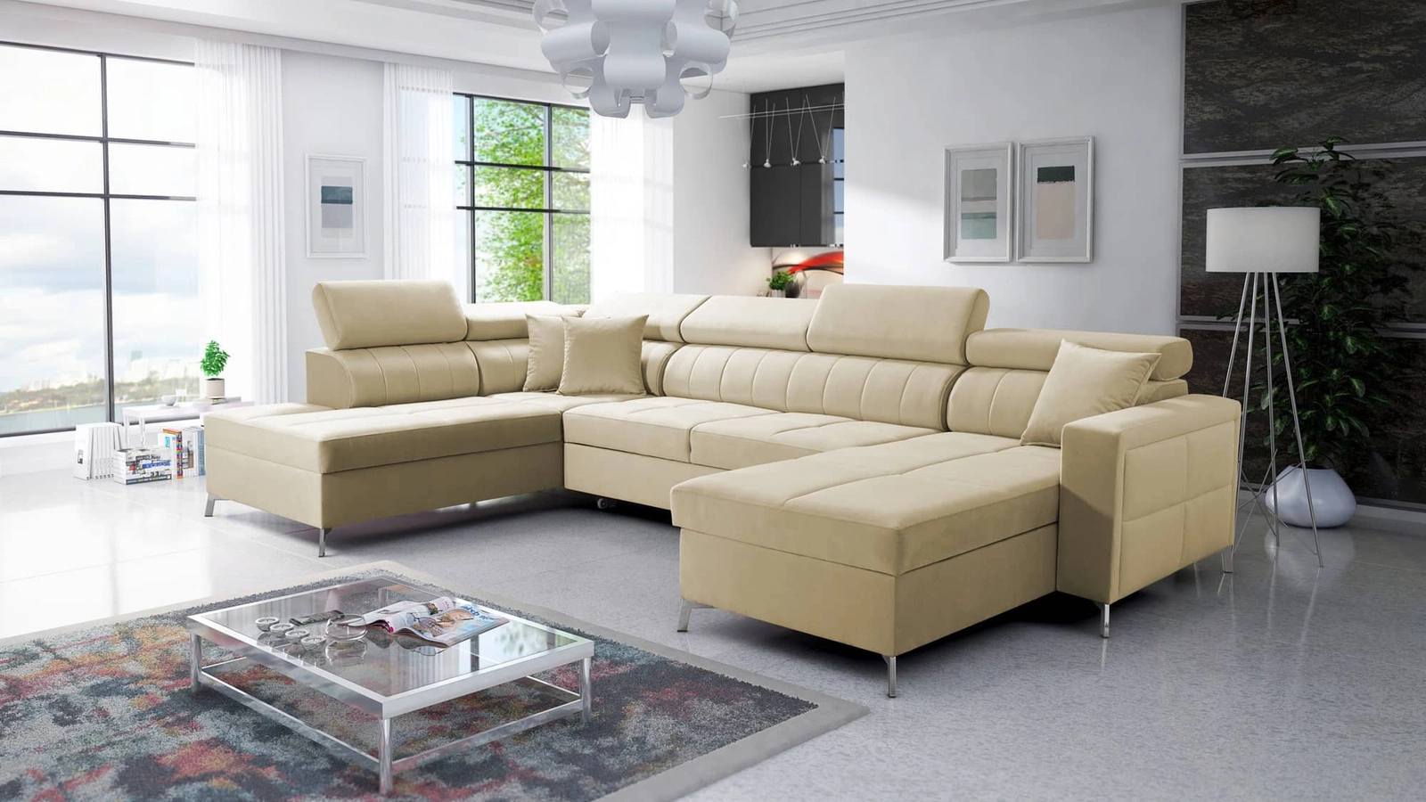 Rohová pohovka Nausa VI v béžové barvě s nastavitelnými opěrkami hlavy je elegantním kusem nábytku, který se hodí do každého interiéru.