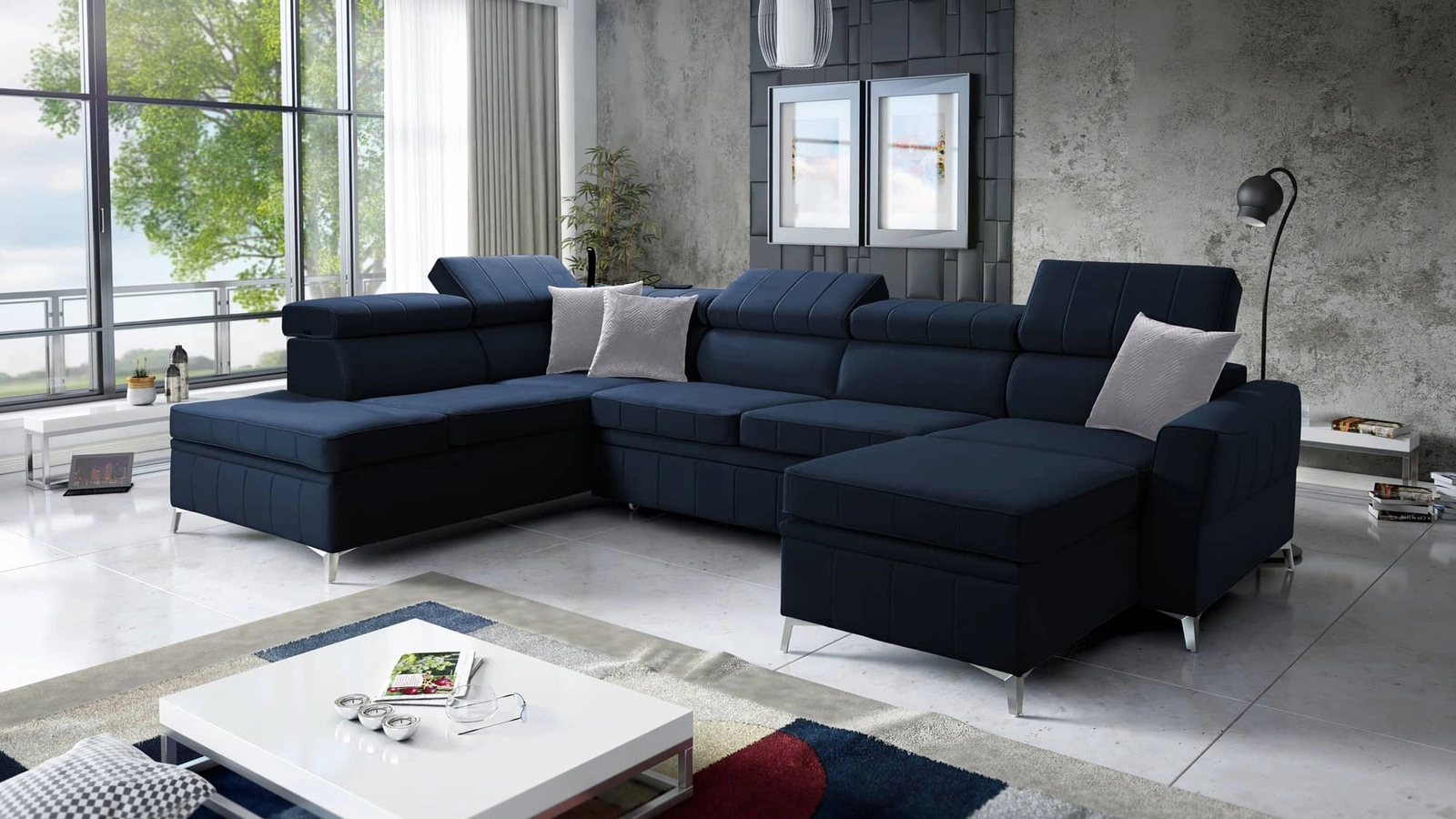 Rohová pohovka Rava VI v tmavě modré barvě s nastavitelnými opěrkami hlavy je elegantní kus nábytku, který se hodí do každého interiéru.