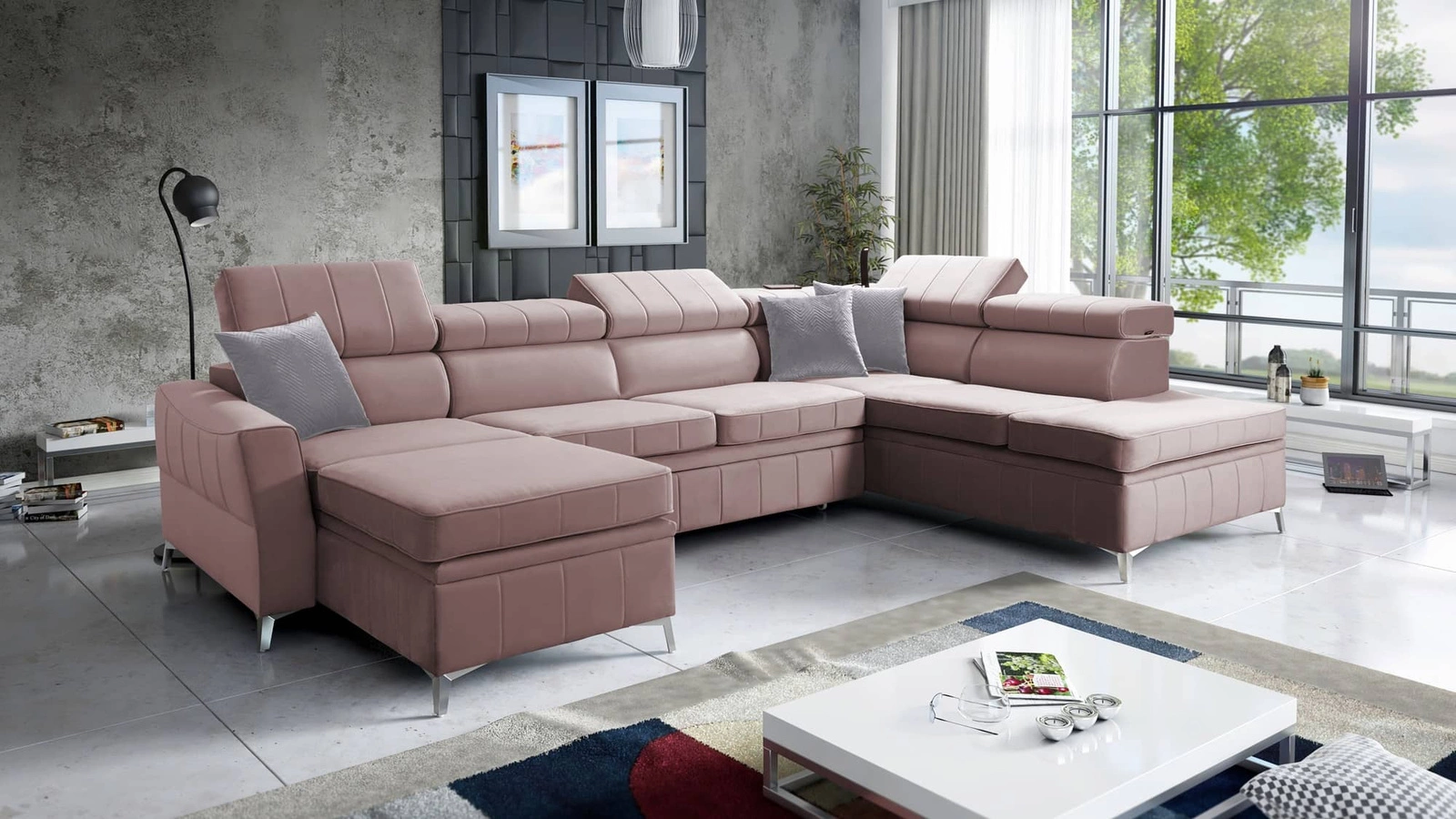 Rohová pohovka Rava VI v levandulově růžové barvě s nastavitelnými opěrkami hlavy je elegantní kus nábytku, který se hodí do každého interiéru.