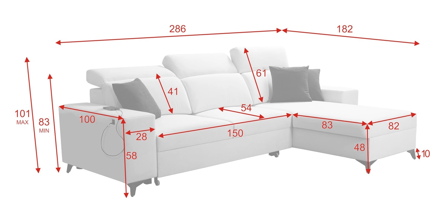 Rozměry nábytku umožňují vyplnění prostoru v prostorném obývacím pokoji nebo zasedací místnosti. Šířka rohu 286 cm, maximální výška 101 cm a hloubka 182 cm. Spací plocha rohové jednotky je 122x230 cm. Výška sedadla nábytku je 48 cm a maximální výška opěradla je 61 cm. Vlnité pružiny a polyuretanová pěna T30 je materiál, z něhož je vyrobeno sedadlo rohu. Pevné opěradlo s nastavitelnými opěrkami hlavy zaručuje pohodlný odpočinek po dlouhém dni, který oceníte vy, vaši blízcí i hosté, kteří si na tuto jedinečnou rohovou sedačku sednou.