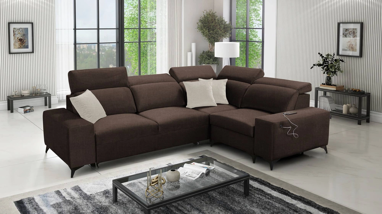 Elegantní rohová pohovka Kelly II v čokoládově hnědé barvě s nastavitelnými opěrkami hlavy je receptem na moderní interiér vašeho domova!