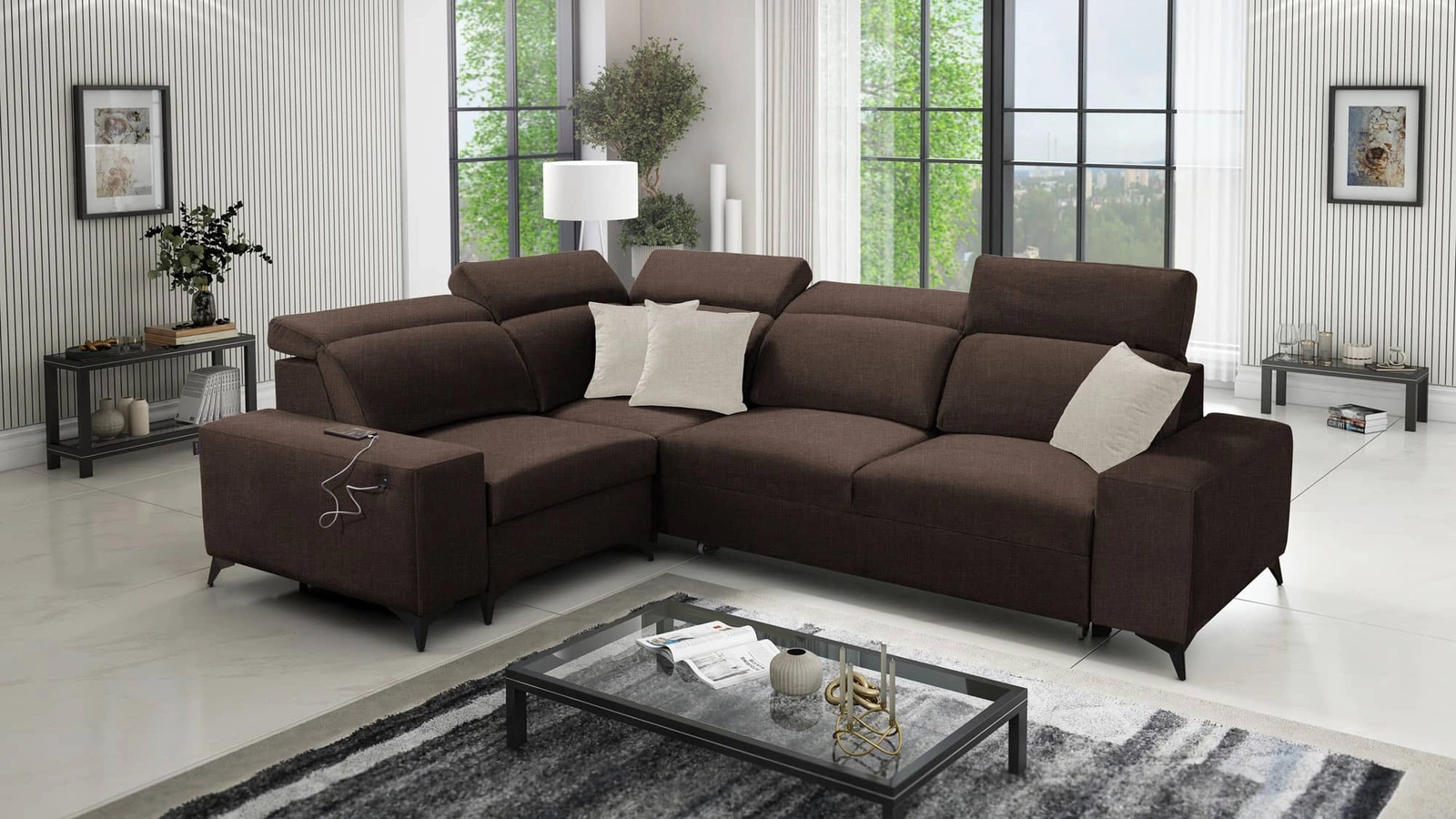 Elegantní rohová pohovka Kelly II v čokoládově hnědé barvě s nastavitelnými opěrkami hlavy je receptem na moderní interiér vašeho domova!