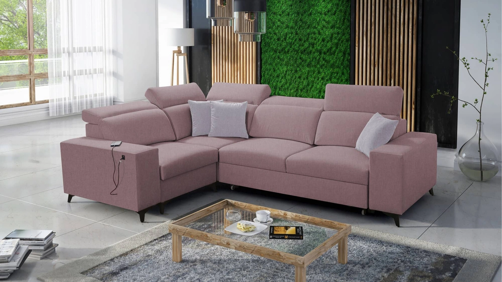 Elegantní rohová pohovka Kelly II v levandulově růžové barvě s nastavitelnými opěrkami hlavy je receptem na moderní interiér vašeho domova!