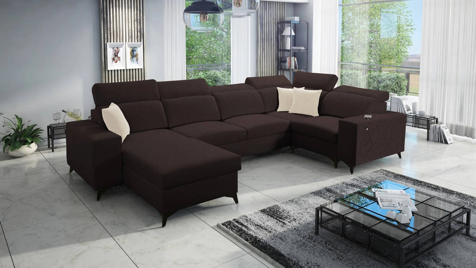 Elegantní rohová pohovka Kelly IV v hnědé barvě s nastavitelnými opěrkami hlavy je receptem na moderní interiér vašeho domova.