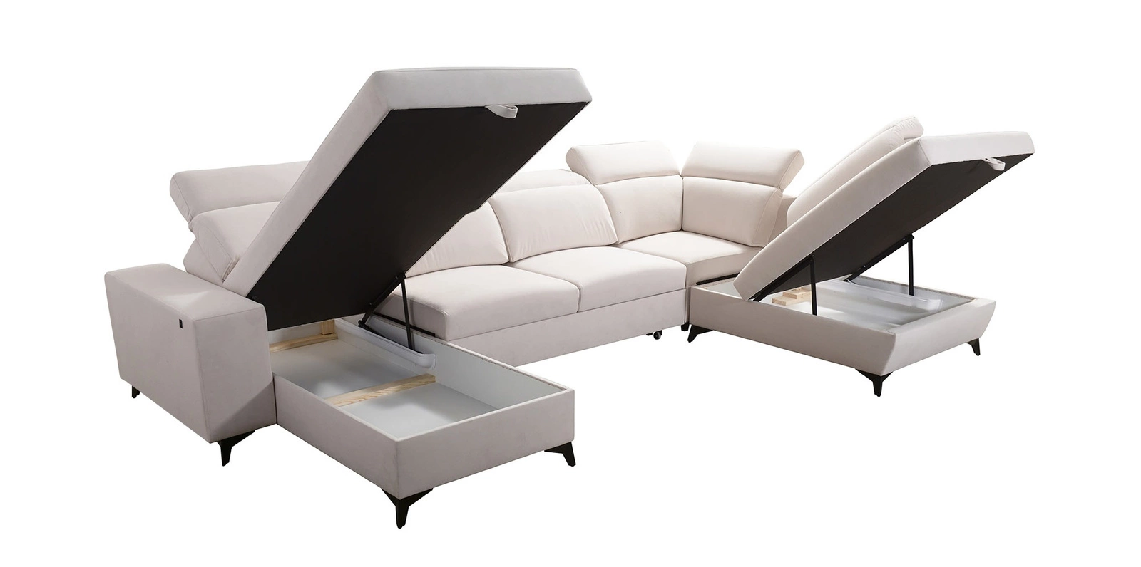 Mezi další vlastnosti tohoto nábytku, které ocení všichni uživatelé, patří kontejnery na lůžkoviny, funkce spaní, zásuvka USB v boční části rohu pro nabíjení telefonu a dalších multimediálních zařízení.