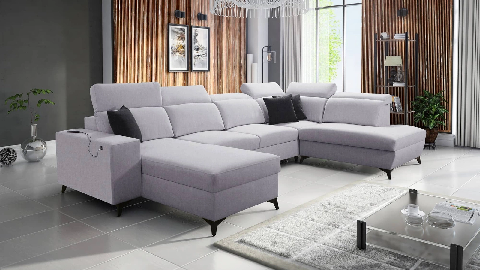 Elegantní rohová pohovka Kelly VI v šedém jasanu s nastavitelnými opěrkami hlavy je receptem na moderní interiér vašeho domova.