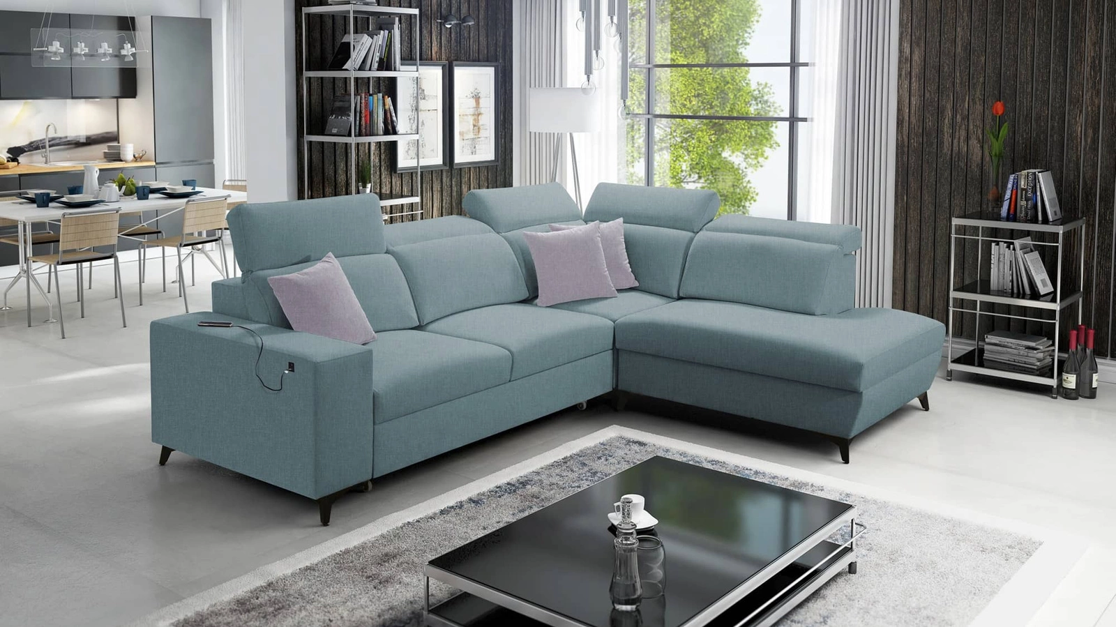 Elegantní rohová pohovka Kelly VII v arktické modři s nastavitelnými opěrkami hlavy je receptem na moderní interiér vašeho domova!
