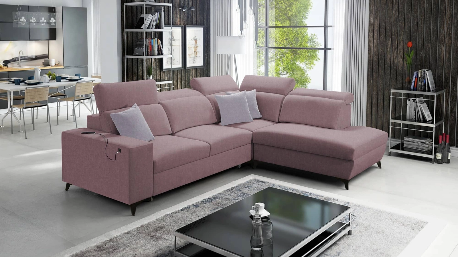 Elegantní rohová pohovka Kelly VII v levandulově růžové barvě s nastavitelnými opěrkami hlavy je receptem na moderní interiér vašeho domova!