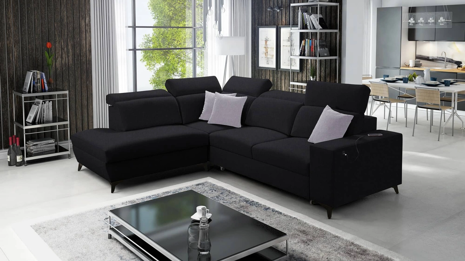 Elegantní rohová pohovka Kelly VII v černé barvě s nastavitelnými opěrkami hlavy je receptem na moderní interiér vašeho domova!