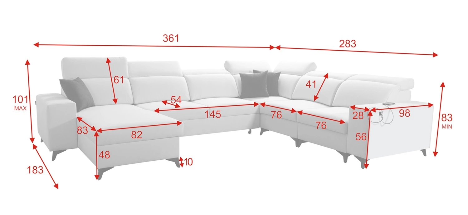 Rozměry nábytku umožňují vyplnění prostoru v prostorném obývacím pokoji nebo zasedací místnosti. Šířka rohu 361 cm, maximální výška 101 cm a hloubka 283 cm. Spací plocha rohové jednotky je 122x283 cm. Výška sedadla nábytku je 48 cm a maximální výška opěradla je 61 cm. Vlnité pružiny a polyuretanová pěna T30 je materiál, z něhož je vyrobeno sedadlo rohu. Pevné opěradlo s nastavitelnými opěrkami hlavy zaručuje pohodlný odpočinek po dlouhém dni, který oceníte vy, vaši blízcí i hosté, kteří si na tuto jedinečnou rohovou sedačku sednou.