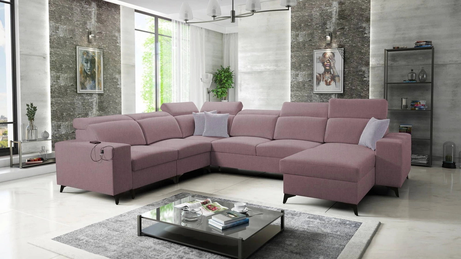 Elegantní rohová pohovka Kelly VIII v levandulově růžové barvě s nastavitelnými opěrkami hlavy je receptem na moderní interiér vašeho domova.