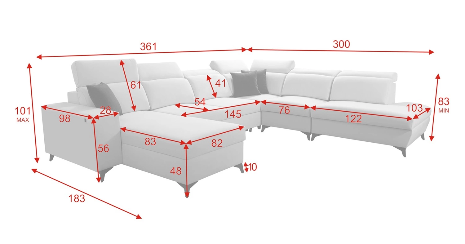 Rozměry nábytku umožňují vyplnění prostoru v prostorném obývacím pokoji nebo zasedací místnosti. Šířka rohu 361 cm, maximální výška 101 cm a hloubka 300 cm. Spací plocha rohové jednotky je 122x283 cm. Výška sedadla nábytku je 48 cm a maximální výška opěradla je 61 cm. Vlnité pružiny a polyuretanová pěna T30 je materiál, z něhož je vyrobeno sedadlo rohu. Pevné opěradlo s nastavitelnými opěrkami hlavy zaručuje pohodlný odpočinek po dlouhém dni, který oceníte vy, vaši blízcí i hosté, kteří si na tuto jedinečnou rohovou sedačku sednou.
