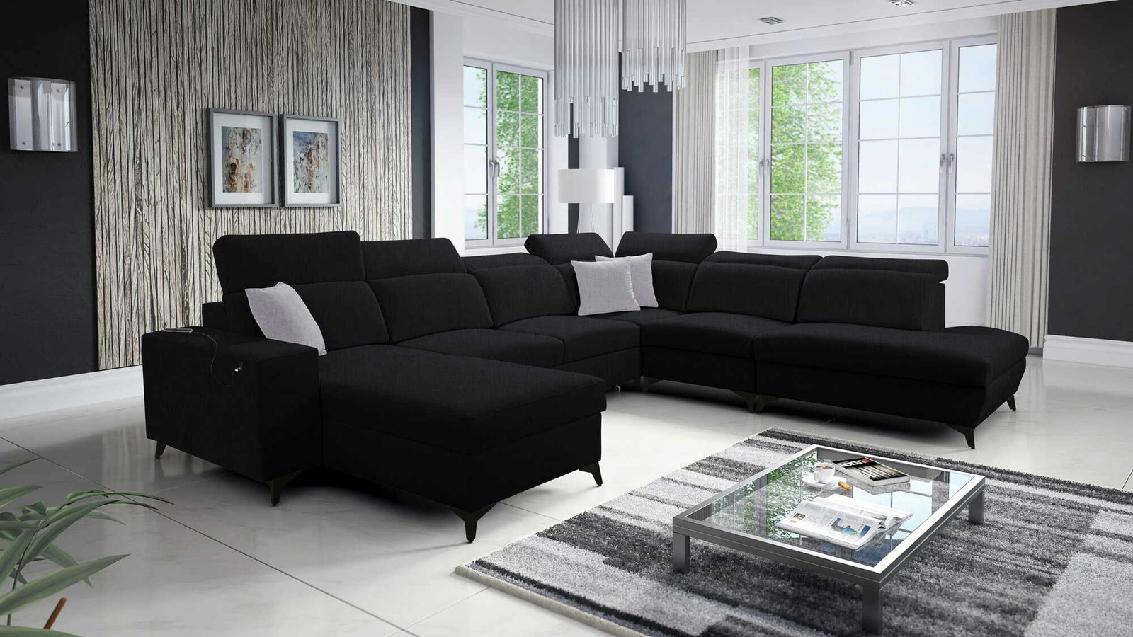 Kelly Sleek X černá levá rohová sedačka s funkcí spaní mimořádně elegantní rohová sedačka do obývacího pokoje s nastavitelnými opěrkami hlavy