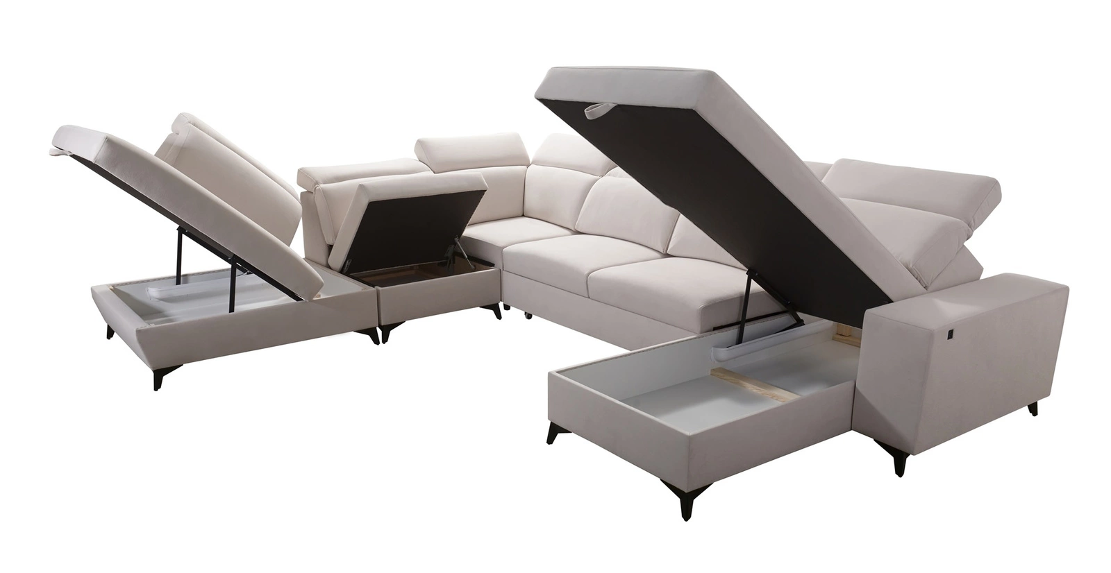 Mezi další vlastnosti tohoto nábytku, které ocení všichni uživatelé, patří kontejnery na lůžkoviny, funkce spaní, zásuvka USB v boční části rohu pro nabíjení telefonu a dalších multimediálních zařízení.