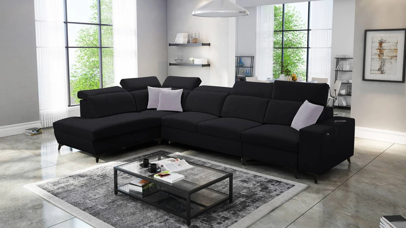 Elegantní rohová pohovka Kelly XI v černé barvě s nastavitelnými opěrkami hlavy je receptem na moderní interiér vašeho domova!