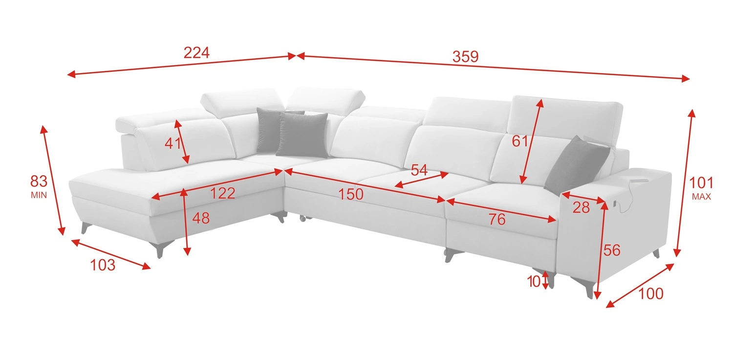 Rozměry nábytku umožňují vyplnění prostoru v prostorném obývacím pokoji nebo zasedací místnosti. Šířka rohu 359 cm, maximální výška 101 cm a hloubka 224 cm. Spací plocha rohové jednotky je 122x202 cm. Výška sedadla nábytku je 48 cm a maximální výška opěradla je 61 cm. Vlnité pružiny a polyuretanová pěna T30 je materiál, z něhož je vyrobeno sedadlo rohu. Pevné opěradlo s nastavitelnými opěrkami hlavy zaručuje pohodlný odpočinek po dlouhém dni, který oceníte vy, vaši blízcí i hosté, kteří si na tuto jedinečnou rohovou sedačku sednou.