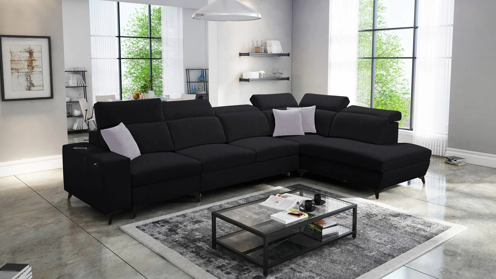 Elegantní rohová pohovka Kelly XI v černé barvě s nastavitelnými opěrkami hlavy je receptem na moderní interiér vašeho domova!