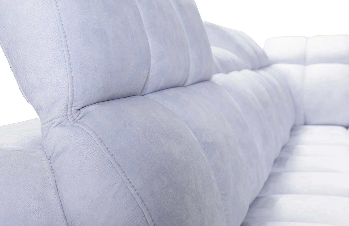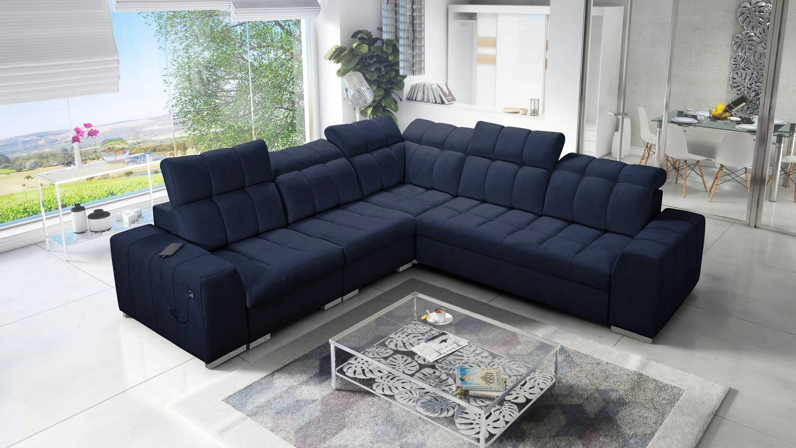 Rohová pohovka Luigi III v tmavě modré barvě s nastavitelnými opěrkami hlavy je nádherný kus nábytku se zárukou nejvyššího pohodlí a funkčnosti.