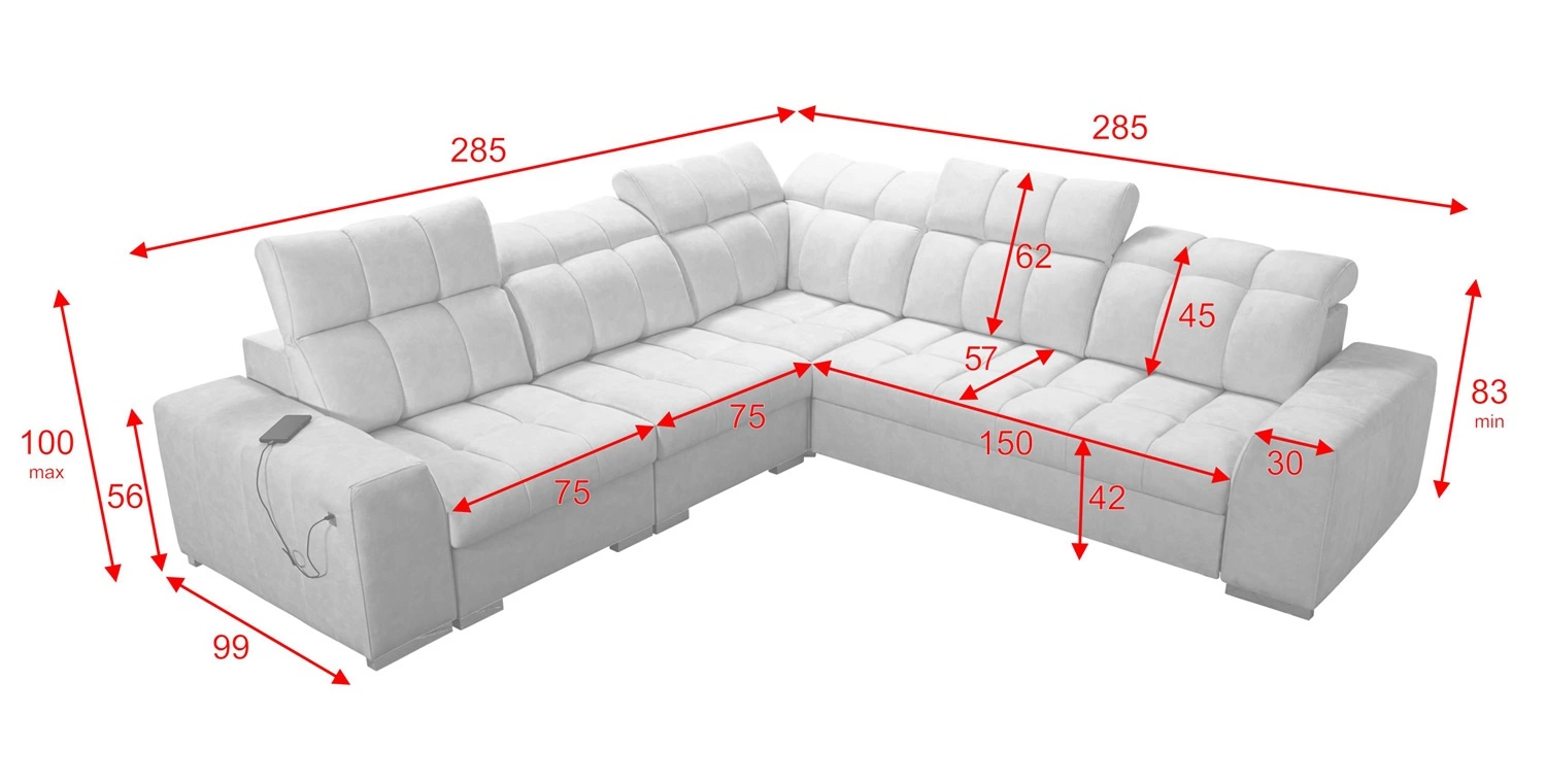Rozměry nábytku umožní vyplnění prostoru v prostorném obývacím pokoji nebo zasedací místnosti. Šířka rohu 285 cm, maximální výška 100 cm a hloubka 285 cm. Spací plocha rohové jednotky je 127x210 cm. Výška sedadla nábytku je 42 cm a maximální výška opěradla je 62 cm. Vlnité pružiny a polyuretanová pěna T30 je materiál, z něhož je vyrobeno sedadlo rohu. Pevné opěradlo s nastavitelnými opěrkami hlavy umožní snadné adaptace úhel opěrek hlavy podle vašich preferencí a zaručí vám pohodlný odpočinek po dlouhém dni, který oceníte vy, vaši blízcí i hosté, kteří se na tuto jedinečnou rohovou pohovku posadí.