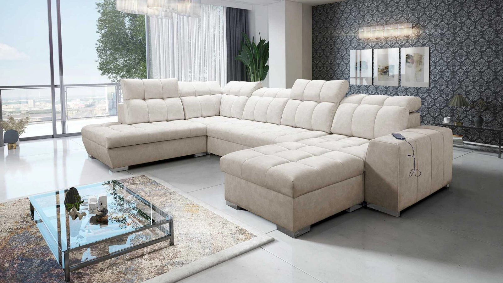 Rohová pohovka Luigi VI v béžové barvě s nastavitelnými opěrkami hlavy je nádherný kus nábytku se zárukou nejvyššího pohodlí a funkčnosti.