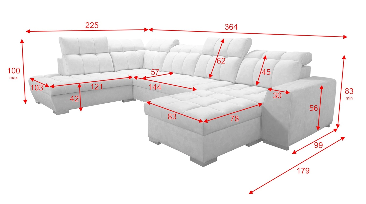 Rozměry nábytku umožní vyplnění prostoru v prostorném obývacím pokoji nebo zasedací místnosti. Šířka rohu 364 cm, maximální výška 100 cm a hloubka 225 cm. Spací plocha rohové jednotky je 133x282 cm. Výška sedadla nábytku je 42 cm a maximální výška opěradla je 62 cm. Vlnité pružiny a polyuretanová pěna T30 je materiál, z něhož je vyrobeno sedadlo rohu. Pevné opěradlo s nastavitelnými opěrkami hlavy umožní snadné adaptace úhel opěrek hlavy podle vašich preferencí a zaručí vám pohodlný odpočinek po dlouhém dni, který oceníte vy, vaši blízcí i hosté, kteří se na tuto jedinečnou rohovou pohovku posadí.