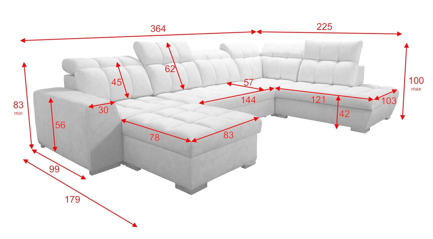 Rozměry nábytku umožní vyplnění prostoru v prostorném obývacím pokoji nebo zasedací místnosti. Šířka rohu 364 cm, maximální výška 100 cm a hloubka 225 cm. Spací plocha rohové jednotky je 133x282 cm. Výška sedadla nábytku je 42 cm a maximální výška opěradla je 62 cm. Vlnité pružiny a polyuretanová pěna T30 je materiál, z něhož je vyrobeno sedadlo rohu. Pevné opěradlo s nastavitelnými opěrkami hlavy umožní snadné adaptace úhel opěrek hlavy podle vašich preferencí a zaručí vám pohodlný odpočinek po dlouhém dni, který oceníte vy, vaši blízcí i hosté, kteří se na tuto jedinečnou rohovou pohovku posadí.