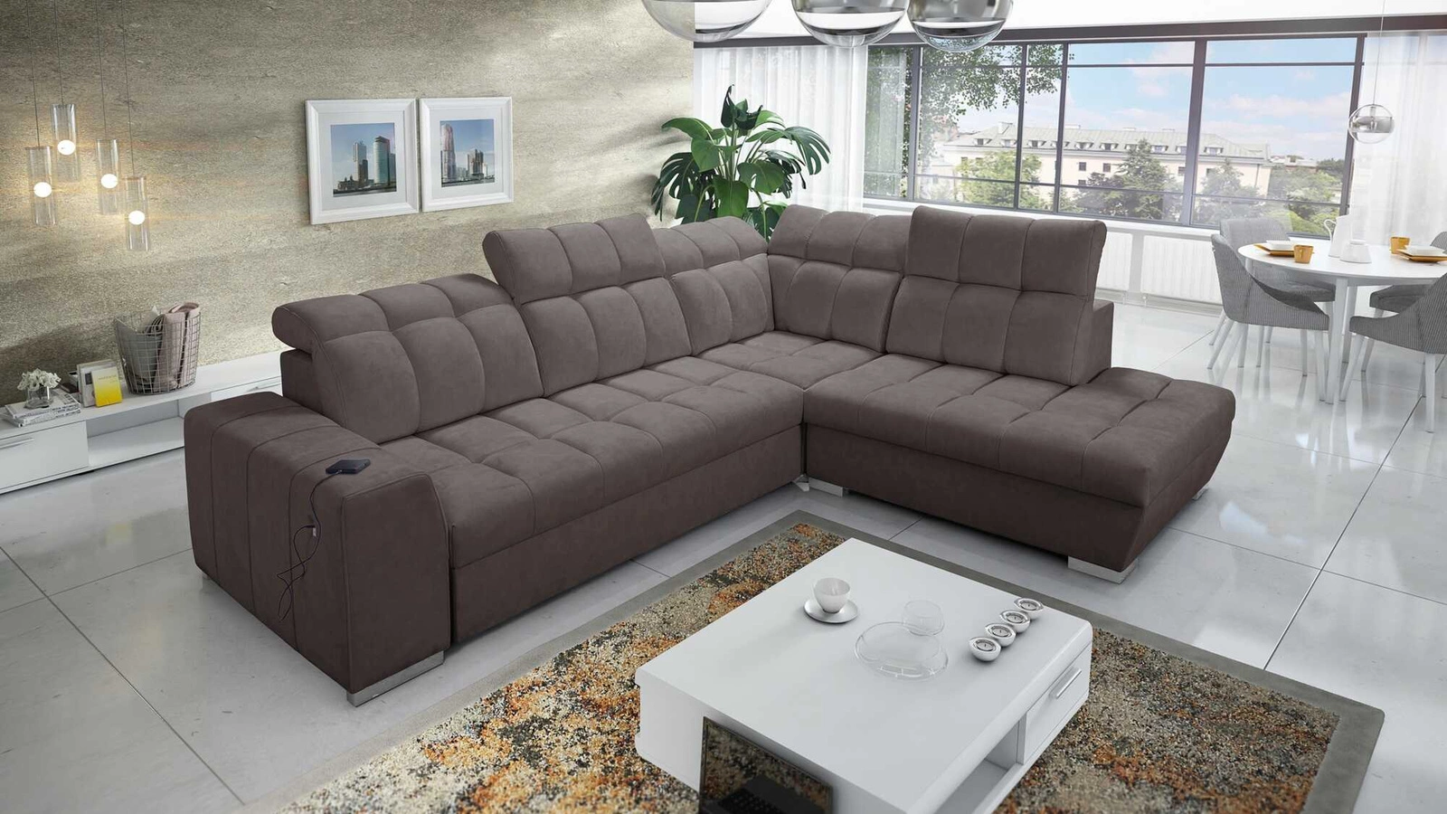 Rohová pohovka Luigi VII v hnědé barvě s nastavitelnými opěrkami hlavy je stylový kus nábytku se zárukou nejvyššího pohodlí a funkčnosti.