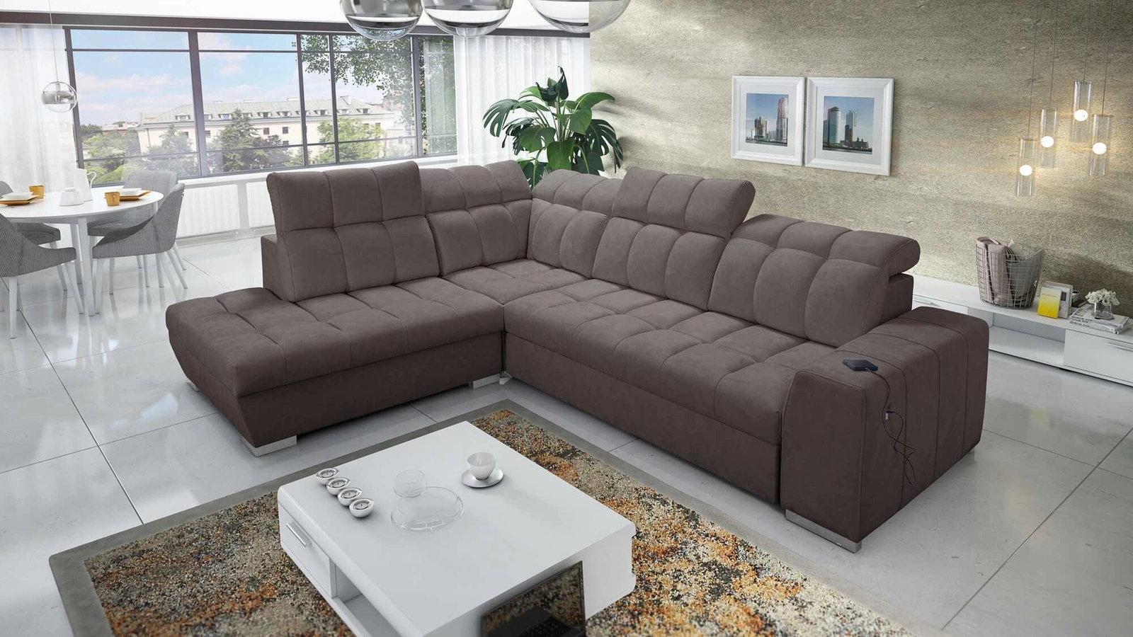 Rohová pohovka s funkcí spaní Luigi VII z sametu Terra 26 zaručuje maximální pohodlí a funkčnost pro každodenní relaxaci v obývacím pokoji, ložnici, pokoji pro hosty nebo v jakékoli jiné místnosti, kam plánujete umístit tuto vysoce moderní a moderní rohovou skříň. Stylové tělo je rozčleněno ozdobnými prvky šití zdobení sedáku a opěradla rohové sedačky. Nastavitelné opěrky hlavy zajistí ještě větší komfort a pohodlí této vysoce moderní rohové jednotky.