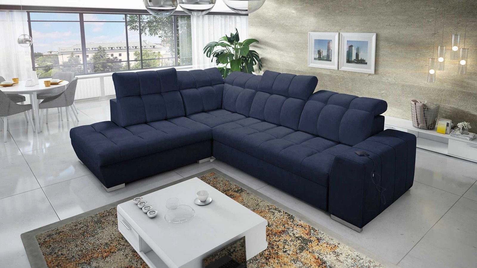 Rohová pohovka Luigi VII v tmavě modré barvě s nastavitelnými opěrkami hlavy je stylový kus nábytku se zárukou nejvyššího pohodlí a funkčnosti.