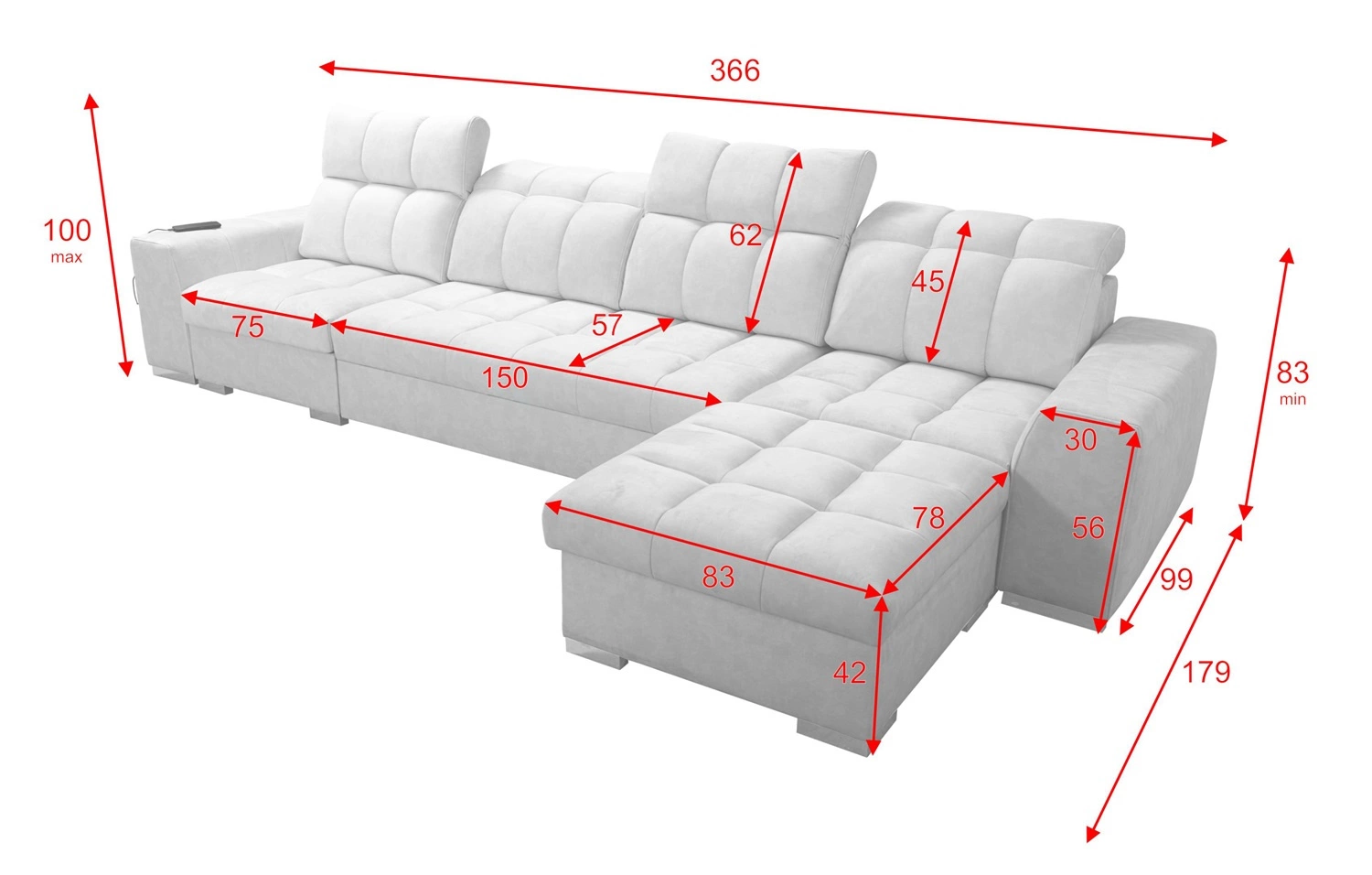 Rozměry nábytku umožní vyplnění prostoru v prostorném obývacím pokoji nebo zasedací místnosti. Šířka rohu 366 cm, maximální výška 100 cm a hloubka 179 cm. Spací plocha rohové jednotky je 127x226 cm. Výška sedadla nábytku je 42 cm a maximální výška opěradla je 62 cm. Vlnité pružiny a polyuretanová pěna T30 je materiál, z něhož je vyrobeno sedadlo rohu. Pevné opěradlo s nastavitelnými opěrkami hlavy umožní snadné adaptace úhel opěrek hlavy podle vašich preferencí a zaručí vám pohodlný odpočinek po dlouhém dni, který oceníte vy, vaši blízcí i hosté, kteří se na tuto jedinečnou rohovou pohovku posadí.