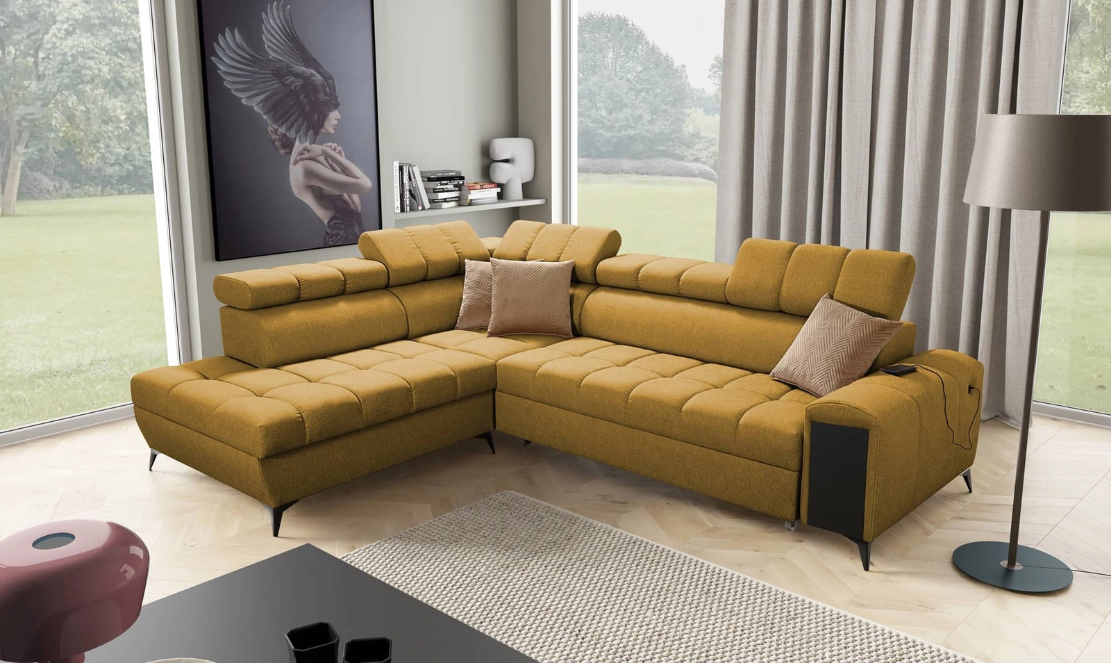 Rohová sedačka s funkcí spaní Bolmso VII hořčice levá elegantní rohová sedačka do obývacího pokoje se zásuvkou a kontejnerem na lůžkoviny