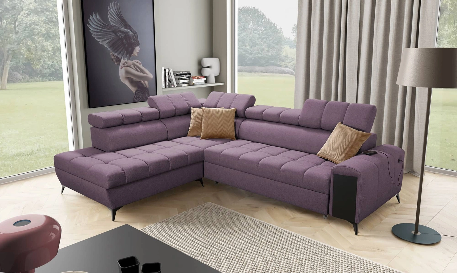 Rohová sedačka s funkcí spaní Bolmso VII fialová levá elegantní rohová sedačka do obývacího pokoje se zásuvkou a kontejnerem na lůžkoviny