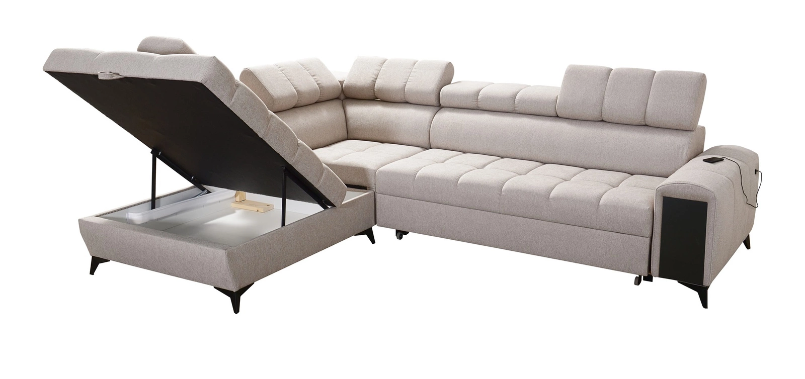 Mezi další funkce tohoto nábytku, které ocení všichni uživatelé, patří kontejner na lůžkoviny, funkce spaní, nabíjecí zásuvka USB v boční části rohové skříně a zásuvka s plnovýsuvným systémem v boční části nábytku.