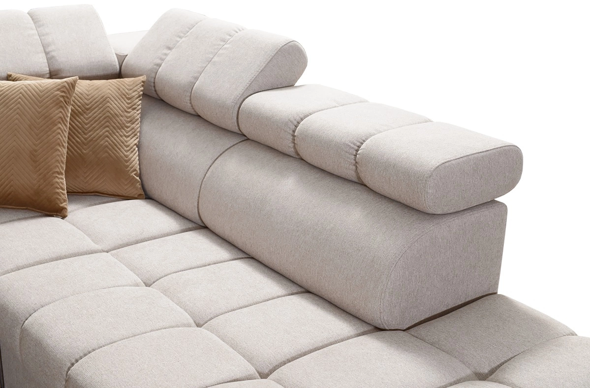 Rozměry nábytku umožňují vyplnění prostoru v prostorném obývacím pokoji nebo zasedací místnosti. Šířka rohu 280 cm, maximální výška 100 cm a hloubka 217 cm. Spací plocha rohové jednotky je 127x210 cm. Výška sedadla nábytku je 45 cm a maximální výška opěradla je 60 cm. Vlnité pružiny a polyuretanová pěna T30 je materiál, z něhož je vyrobeno sedadlo rohu. Zálohování s nastavitelnými opěrkami hlavy vám umožní snadno nastavit úhel opěrek hlavy podle vašich preferencí a zaručí pohodlný odpočinek po dlouhém dni, který oceníte vy, vaši blízcí i hosté, kteří si na tuto jedinečnou rohovou sedačku sednou.