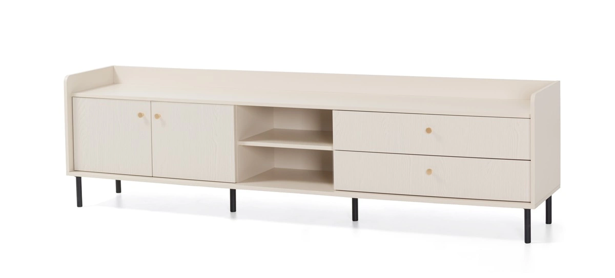 Televizní skříňka je vyrobena z 2 dveře a 2 zásuvky. Skříň Ferdi RTV byla navržena tak, aby byla funkční a použitelná, nabízí dostatek úložného prostoru. Jemné barvy se dokonale hodí ke klasickému prostředí, díky čemuž skříně Ferdi RTV jsou ideální pro prostorné, světlé interiéry moderní styl. Moderní RTV skříně a průmyslové RTV skříně s elegantní povrchovou úpravou dokonale zapadne do jakéhokoli interiéru.
