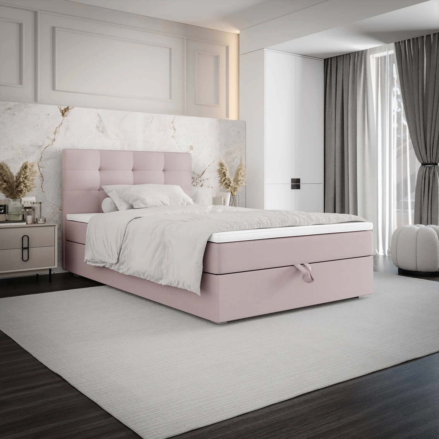 Kontinentální postel Flint 90x200 v pudrově růžové barvě je ideální volbou do každé ložnice nebo pokoje pro mládež.