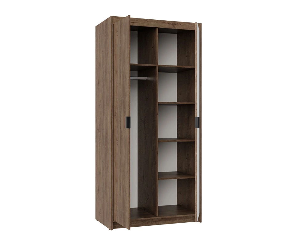 Skříň je vyrobena z 2 výklopné dveře. Šatník zaručuje pohodlný i bezproblémové použití a životnost celého nábytku po mnoho let používání. Kombinace tmavý dub s černými úchyty šatní skříň je úspěšná jako šatní skříň do ložnice, do předsíně nebo do dětského pokoje. Zrcadlové skříně Rene jsou skvělou volbou i do dětského pokoje. Skvěle se hodí i jako šatní skříň do předsíně.