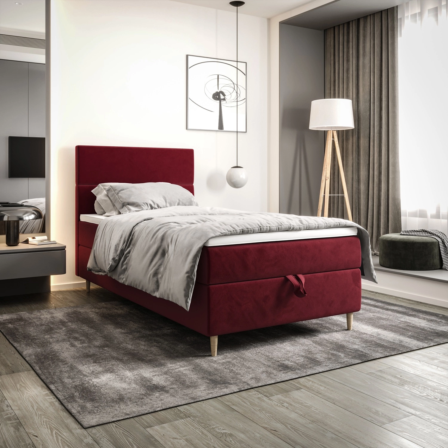 Kontinentální postel Bing 100x200 vínová v moderním skandinávském stylu s čalouněným čelem postele s úložným boxem