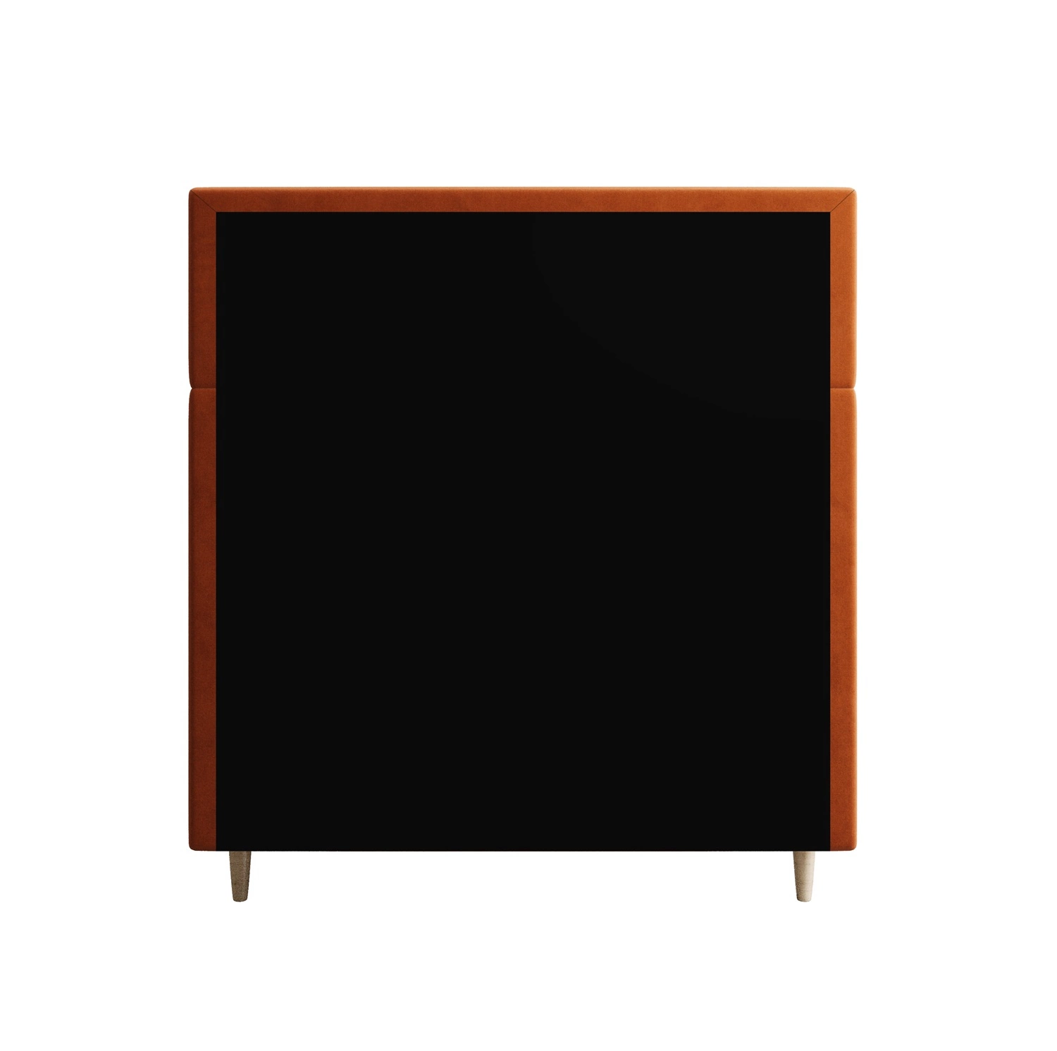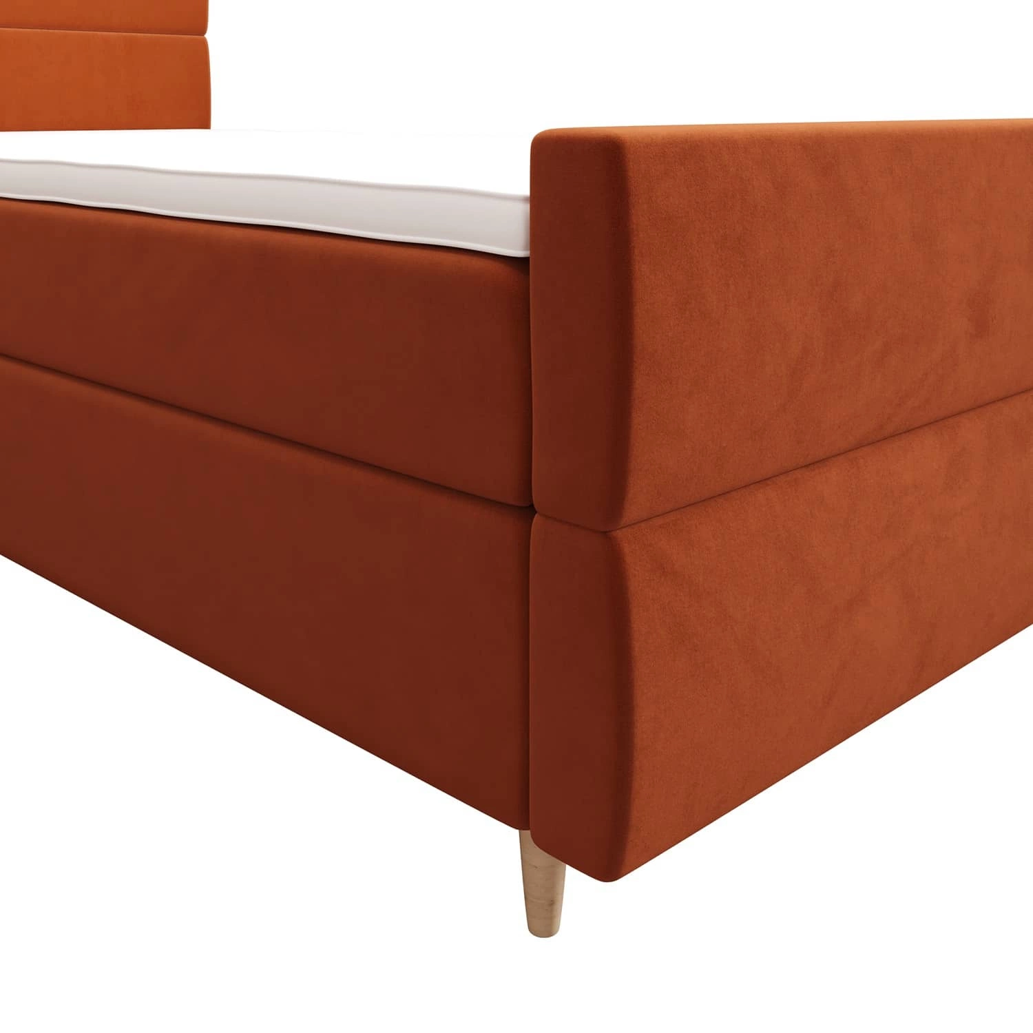 Kontinentální postel Benet 100x200 v cihlově červené barvě v moderním skandinávském stylu s čalouněným čelem a nohami postele s úložným boxem