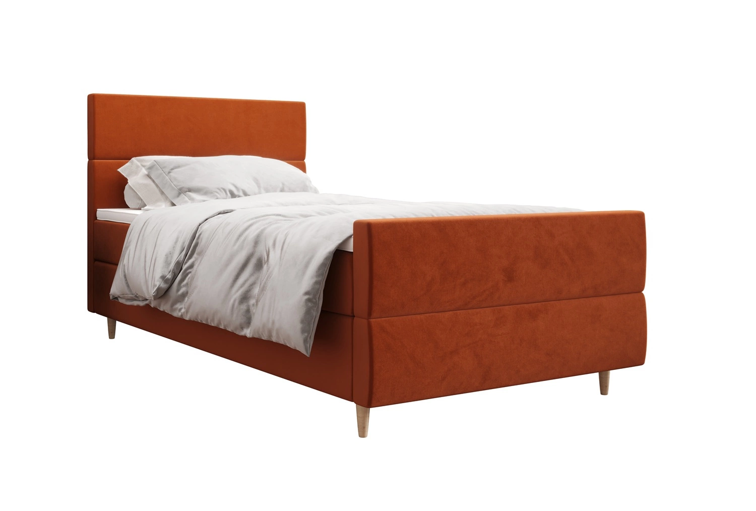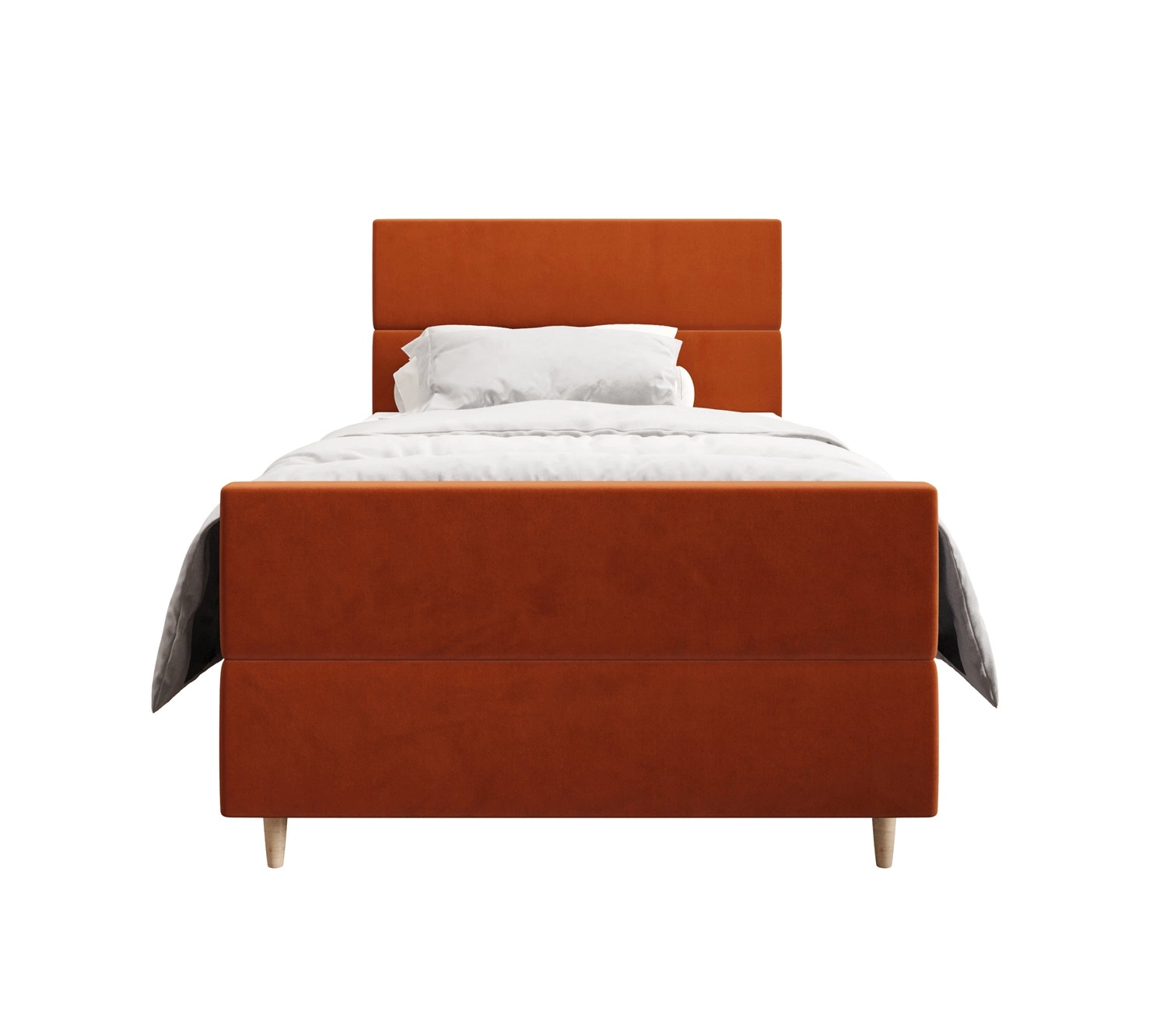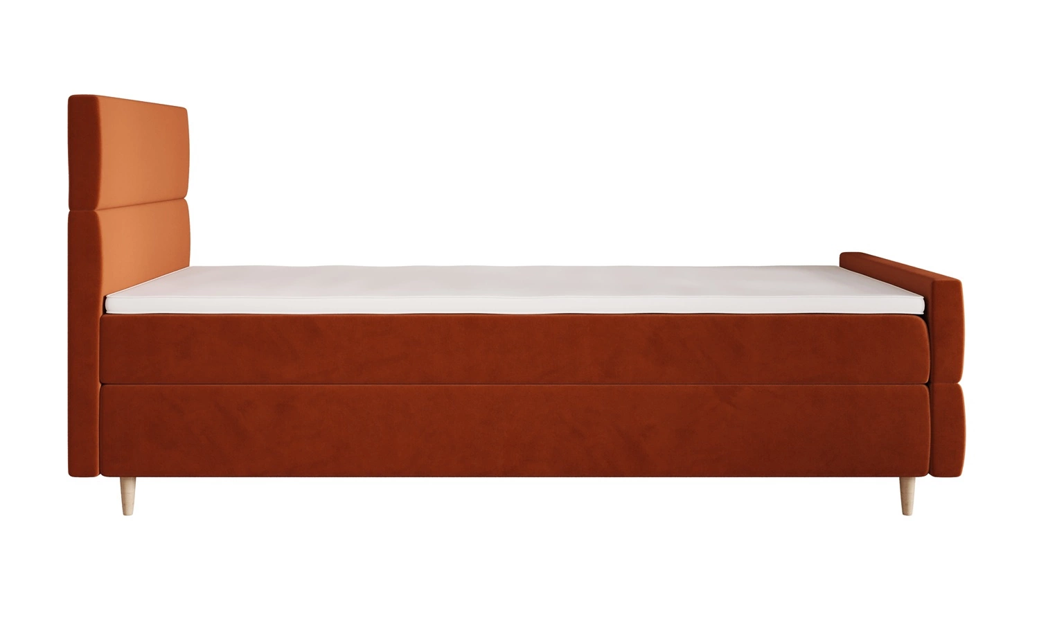 Kontinentální postel Benet 120x200 v cihlově červené barvě v moderním skandinávském stylu s čalouněným čelem a nohami postele s úložným boxem