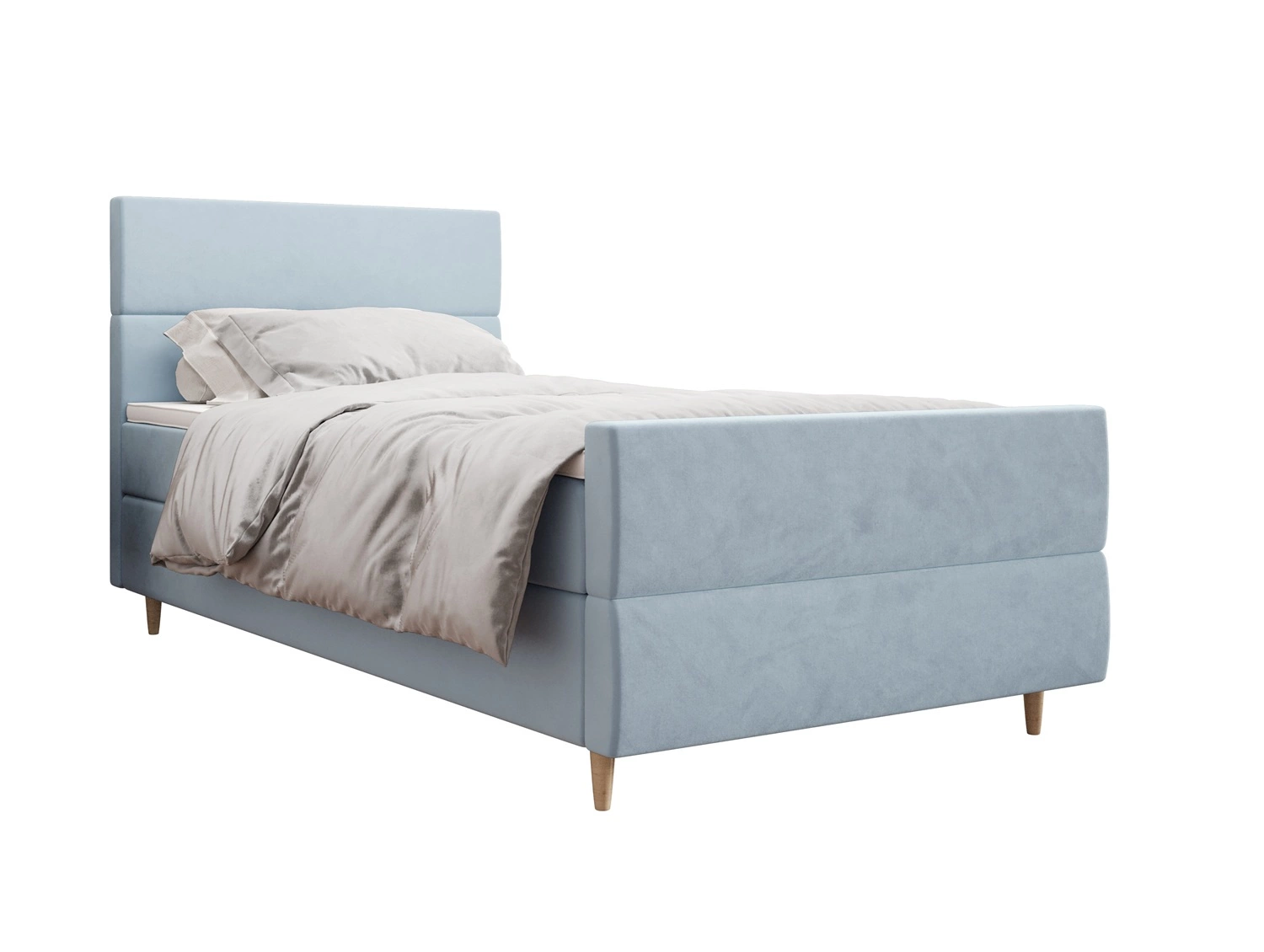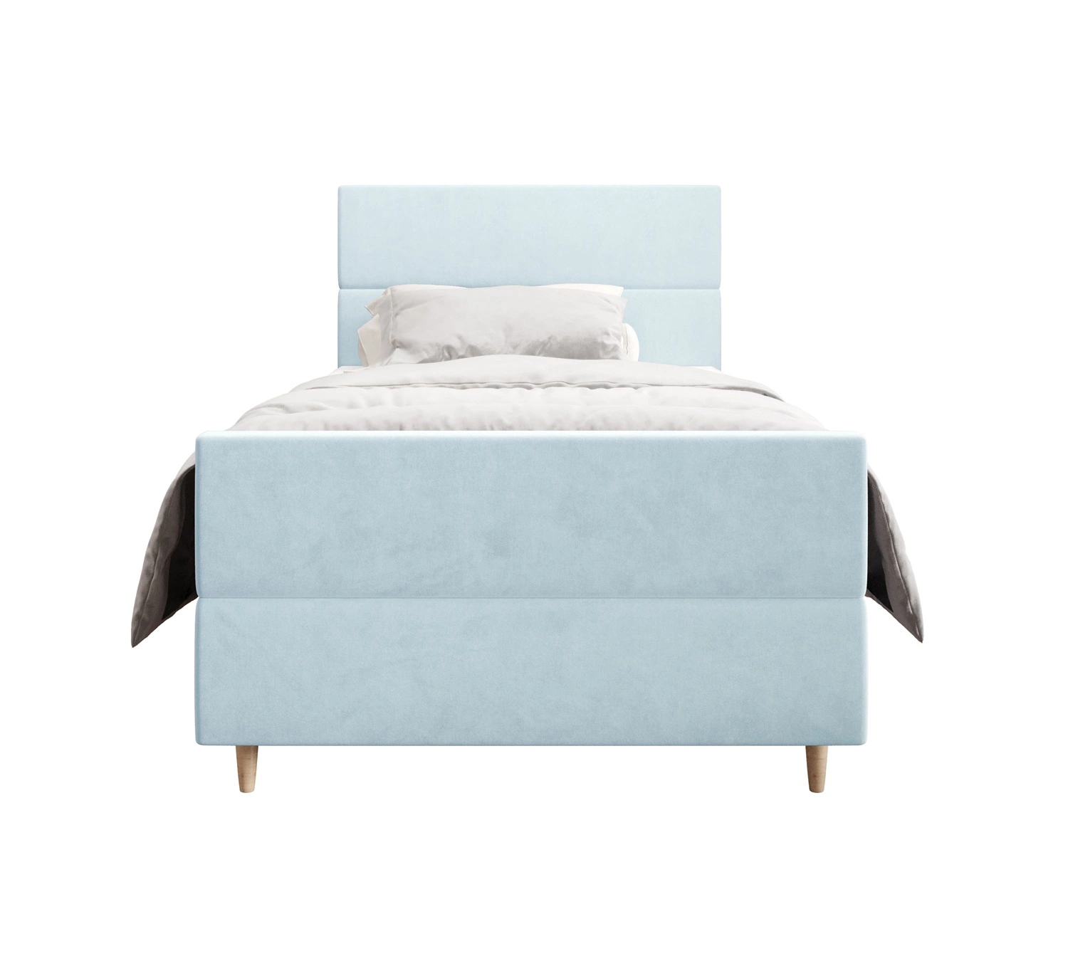Modrá kontinentální postel Benet 90x200 v moderním skandinávském stylu s čalouněným čelem a nohami postele s úložným boxem
