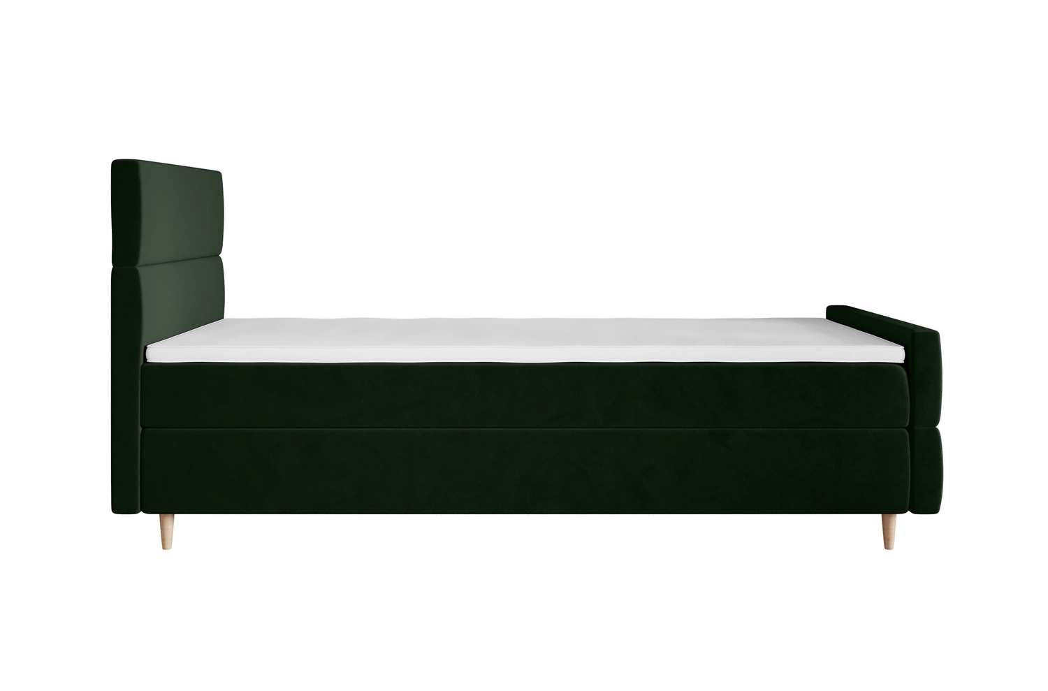 Kontinentální postel Benet 120x200 lahvově zelená v moderním skandinávském stylu s čalouněným čelem a nohou postele s úložným boxem