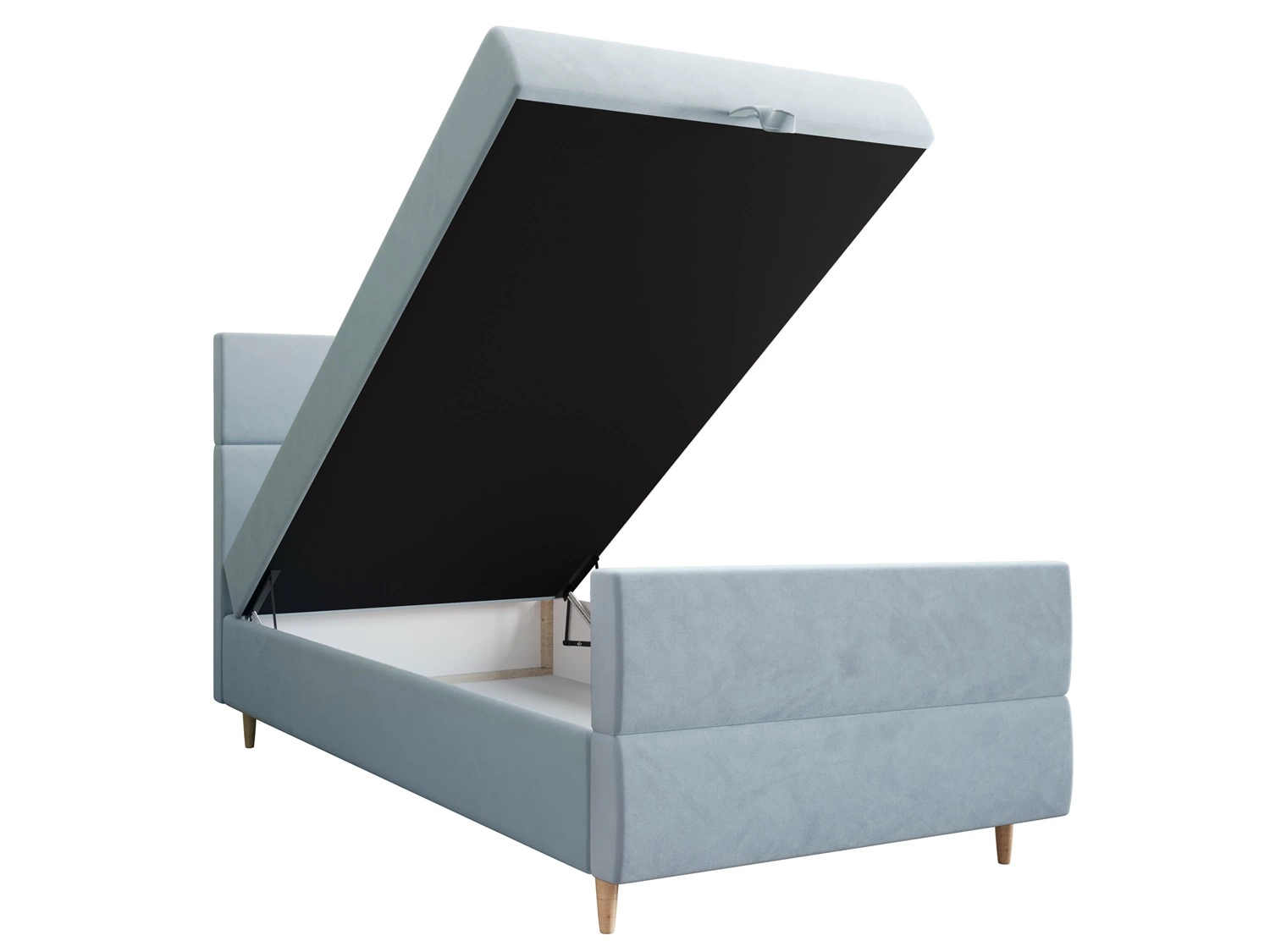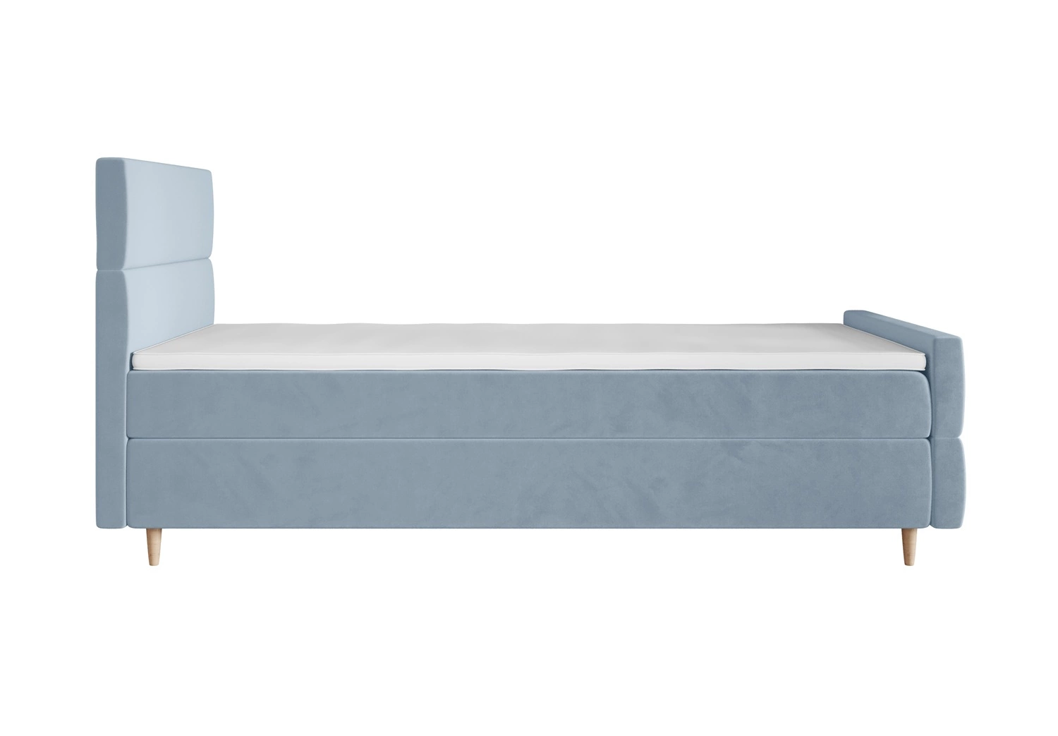 Kontinentální postel Benet 120x200 modrá v moderním skandinávském stylu s čalouněným čelem a nohou postele s úložným boxem
